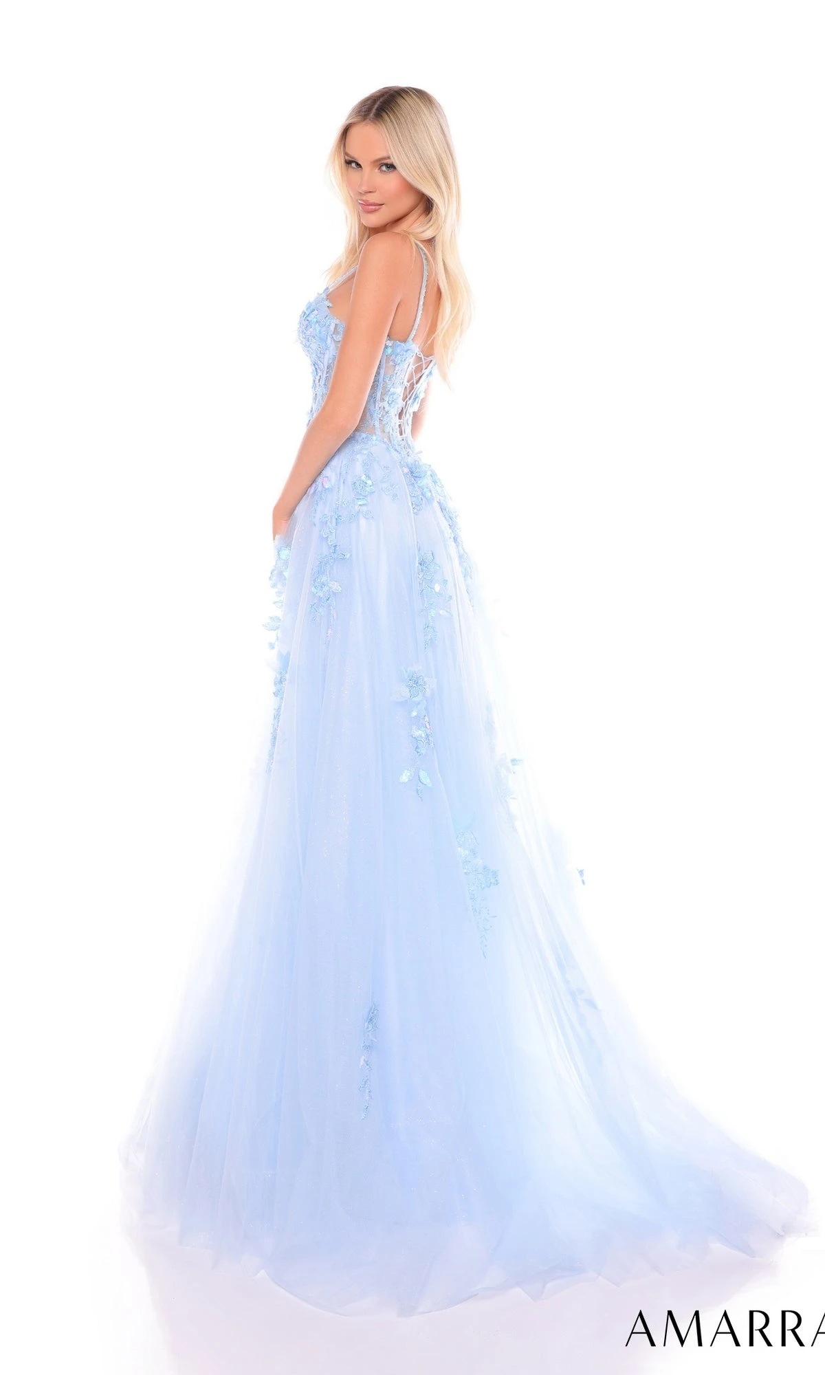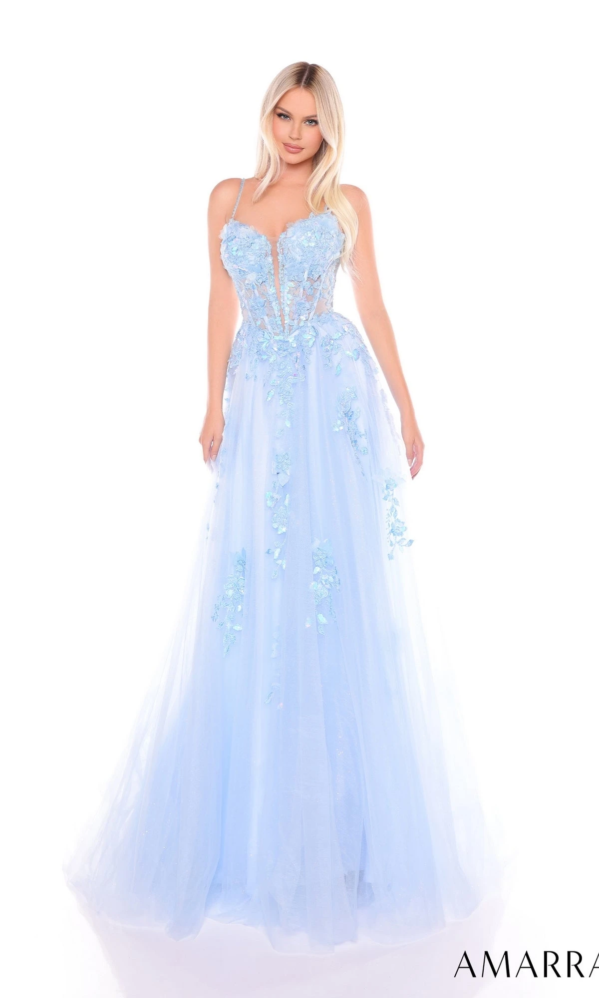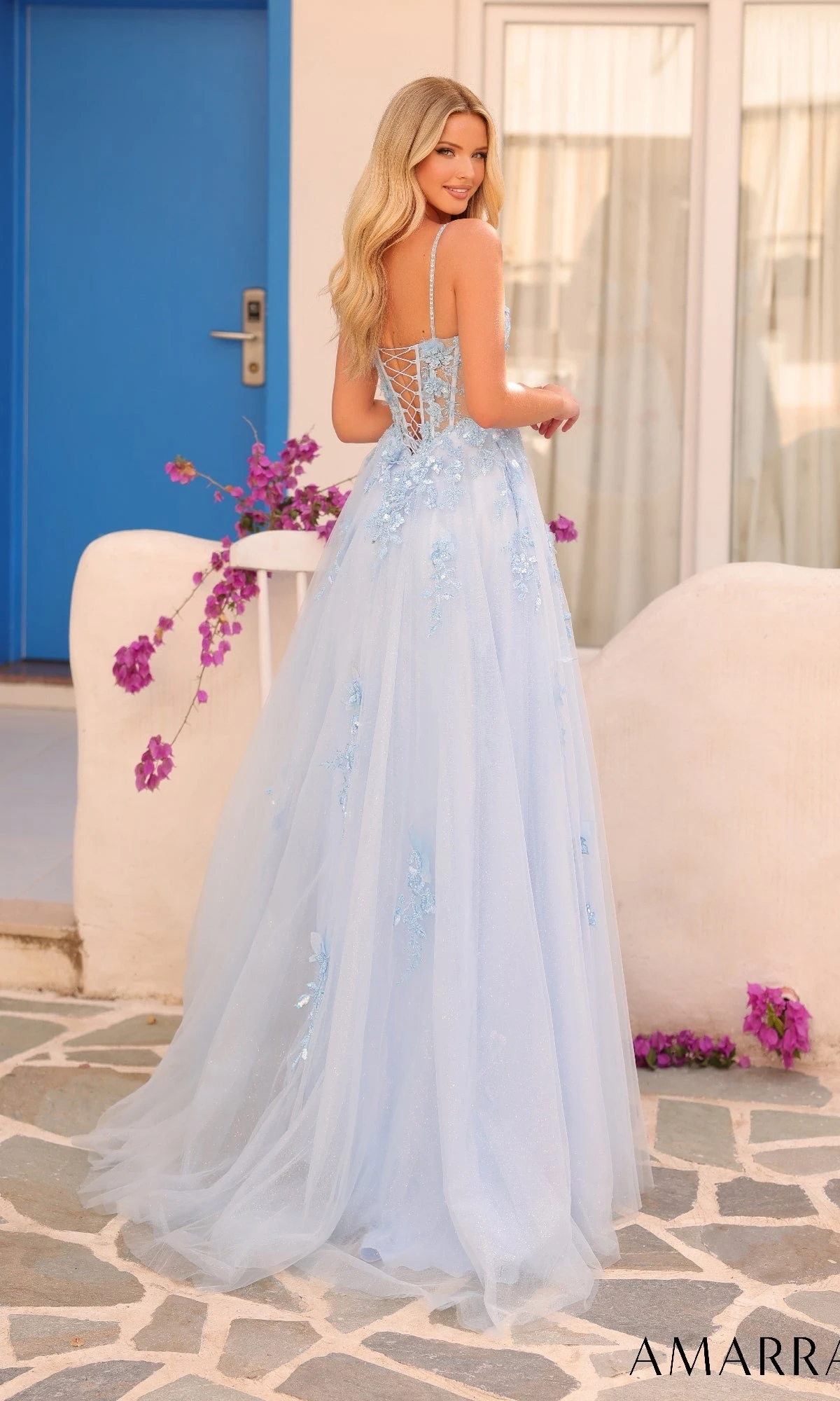 This stunning ball gown for prom features a sheer corset bodice with delicate lace embroidery and a lace-up back that can be adjusted for the perfect fit.