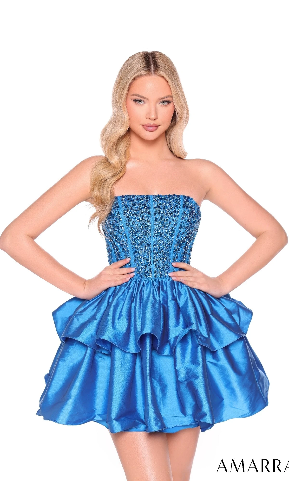 Fit-and-flare strapless short dress featuring a beaded fitted bodice with straight neckline and layered a-line satin skirt.
