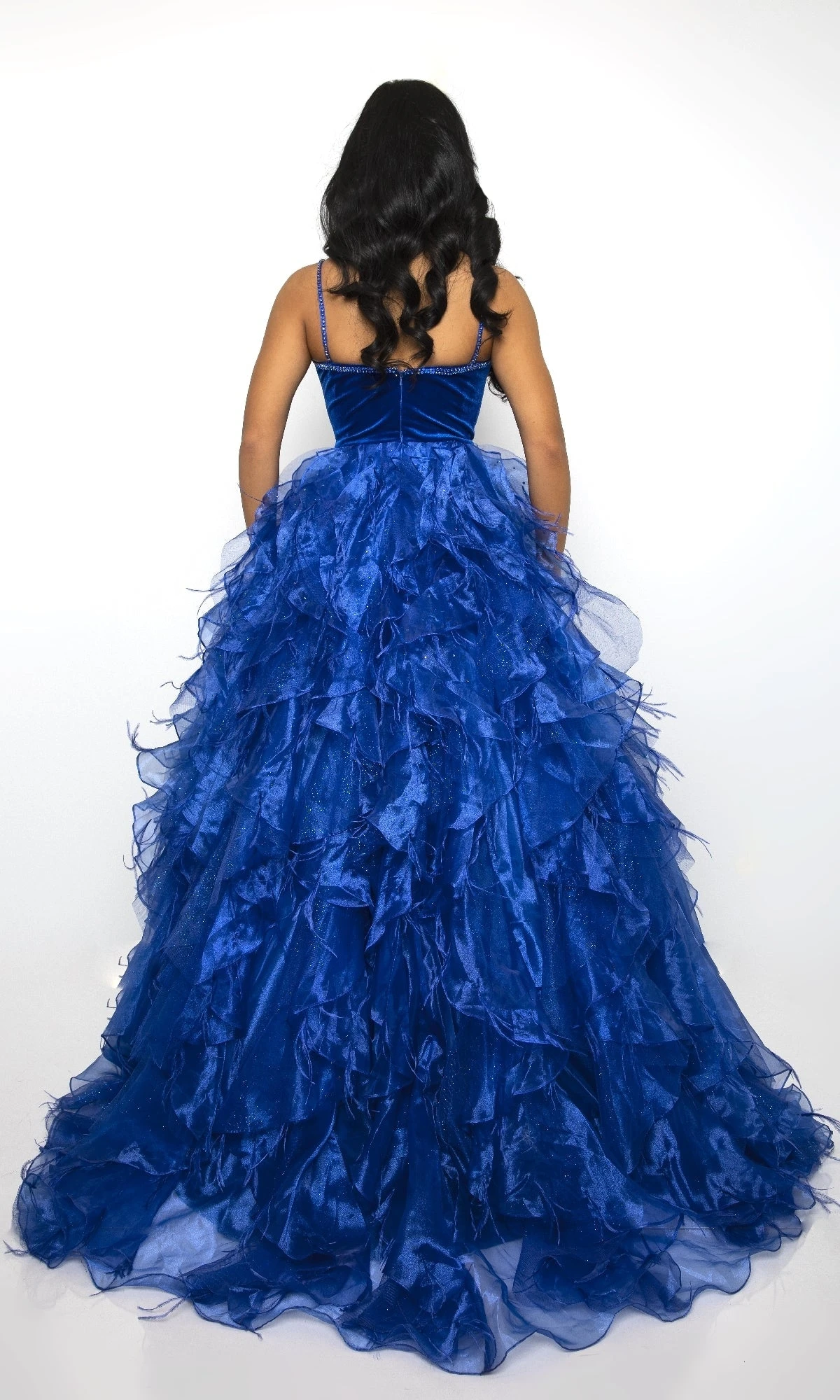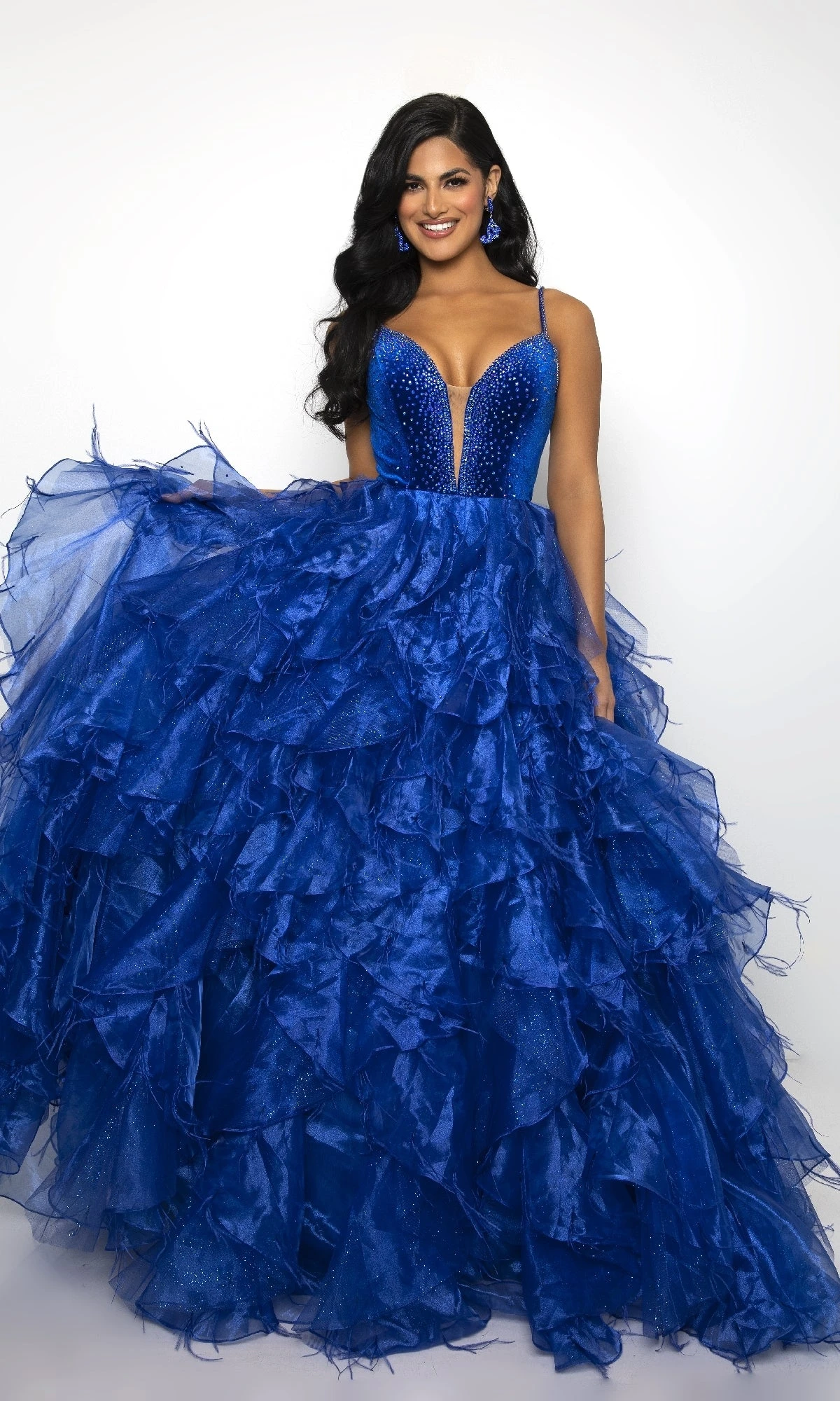 Make a grand entrance in this breathtaking prom ball gown by Ava Presley, style 39554. The deep V-neckline sparkles with beaded trim, while the tiered A-line skirt steals the show with layers of soft feathers and voluminous ruffles. Designed to float gracefully with every step, this floor-length gown is a dreamy choice for prom, galas, or any moment worth remembering.