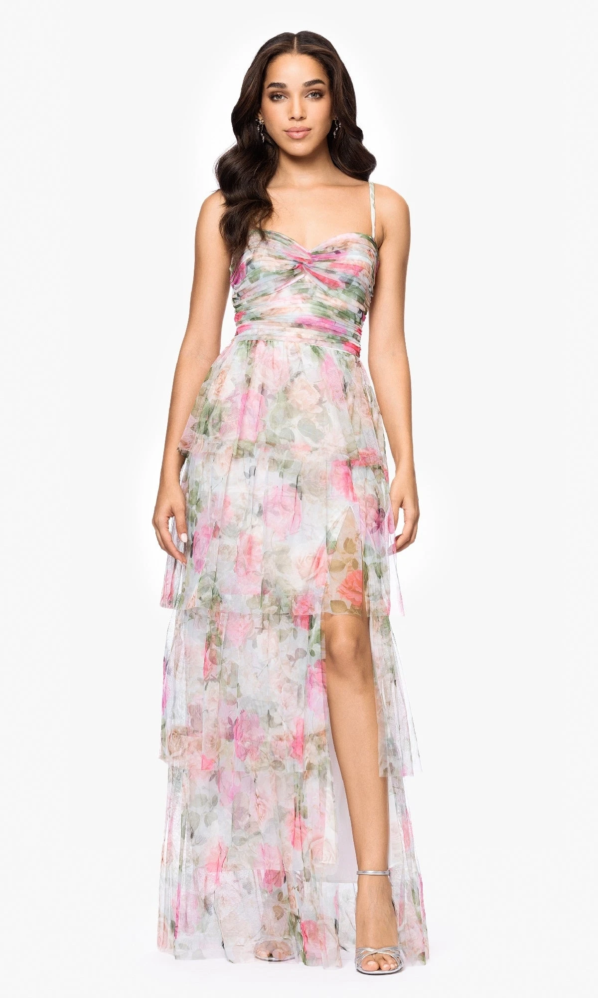 Soft and romantic, this floral-print prom dress by Blondie Nites is a dreamy pick for any formal occasion. The multicolored floral pattern stretches from the sweetheart neckline to the tiered hem, adding a whimsical touch to the flowy silhouette. Designed in junior sizes, it features thin shoulder straps and a lace-up back for an adjustable fit, while a side slit adds just the right hint of flirtiness. A perfect blend of sweetness and style for prom, galas, or any night worth remembering.