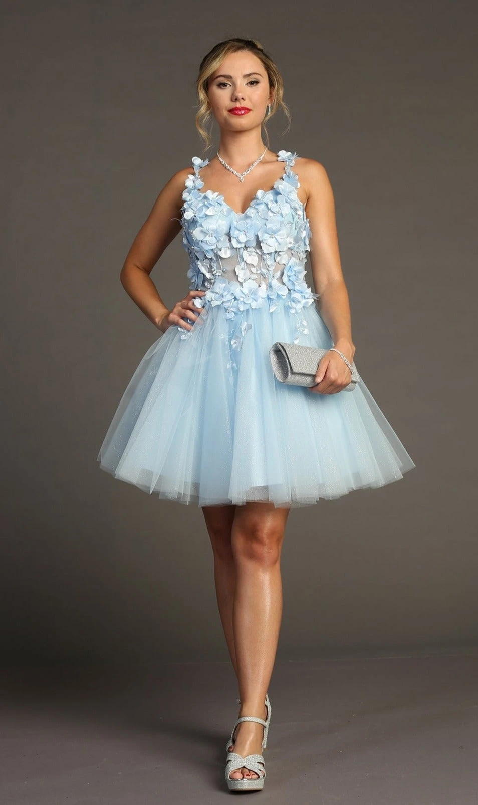 This homecoming dress C321 is an absolute delight, featuring a charming floral-bodice and darling 3-D flowers on the sheer corset-style bodice. Perfect for events like wedding receptions and sweet-16 parties, this short a-line cocktail dress is a stylish and affordable choice. The fully-lined short skirt is complemented by a sheer overlay, adding a flattering a-line shape. At under $150, this short babydoll dress is a wonderful option that will make you stand out with confidence, without breaking the bank.