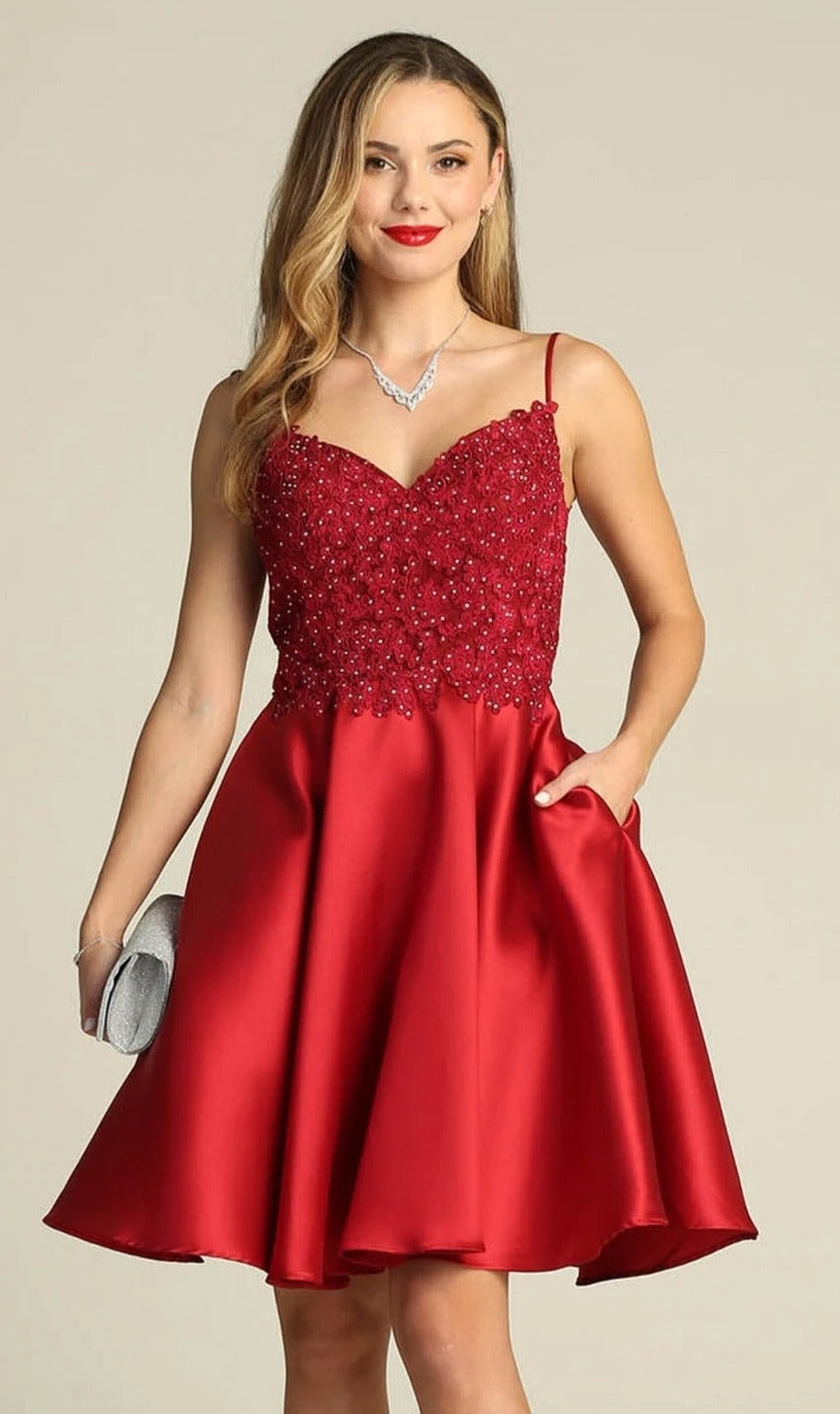 Get ready to shine in the spotlight with this beaded-bodice short a-line homecoming dress XR6008 from Chicas. With a v-neck bodice adorned with delicate lace embellishments, this short cocktail dress will make you stand out at any semi-formal event. Available in misses and plus sizes, it features a modest short a-line skirt with convenient side pockets, perfect for keeping your phone close for those impromptu photos. Make a unforgettable statement at homecoming, wedding receptions, or any special occasion with this classic and elegant dress.