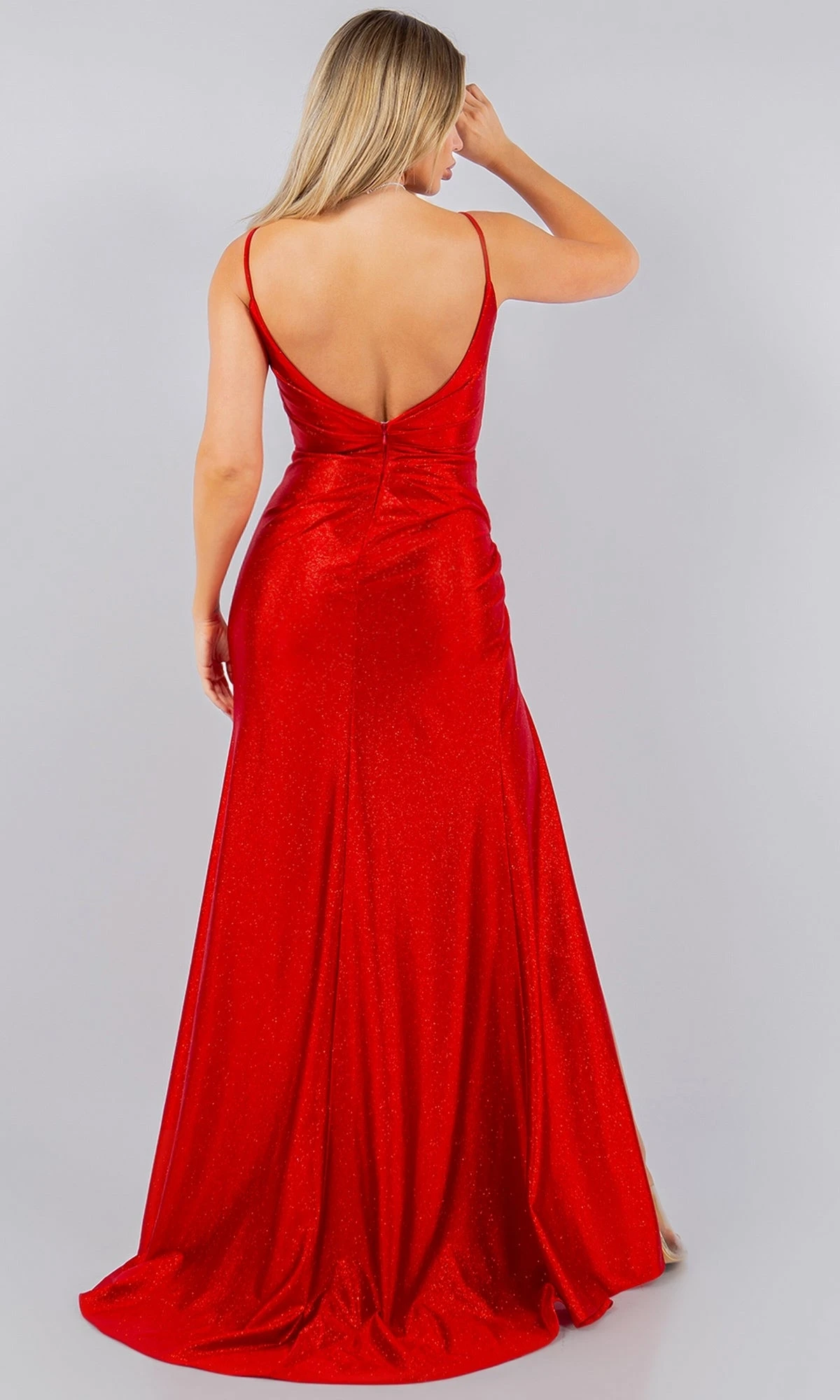 This dress is designed to make you stand out and feel your best during your special event. Its metallic fabric and fitted silhouette create a sleek and elegant look, while the ruched draped hip detail adds a touch of glamour. The side slit adds a subtle hint of sexiness, making it perfect for prom or any formal occasion. Trust us, you’ll shine in this stunning formal dress.