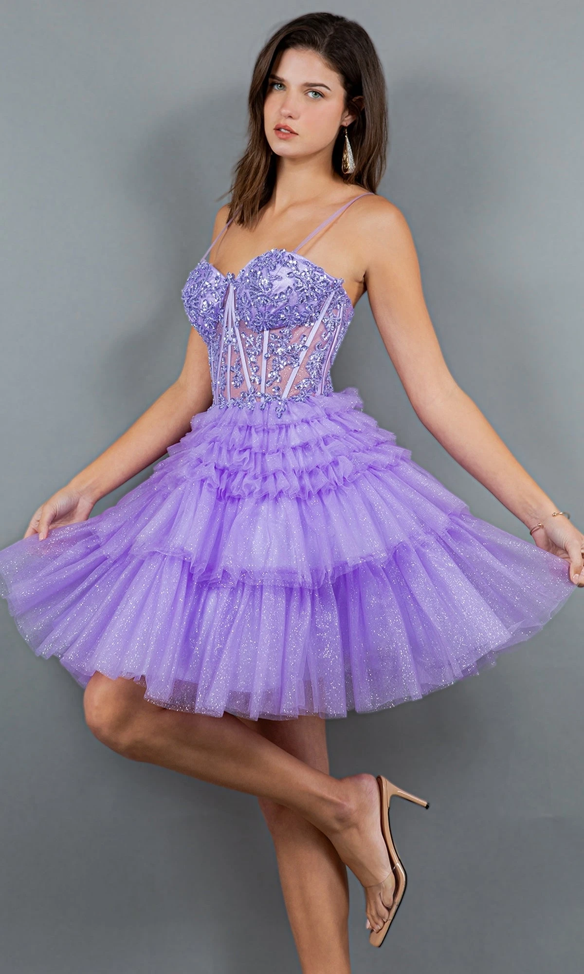 Be the life of the party in this short strapless dress with a sweetheart neckline, ruffled layers, and a sheer corset embellished with delicate details. Whether it’s a playful event or a glamorous occasion, this dress will make you feel confident and stylish.
