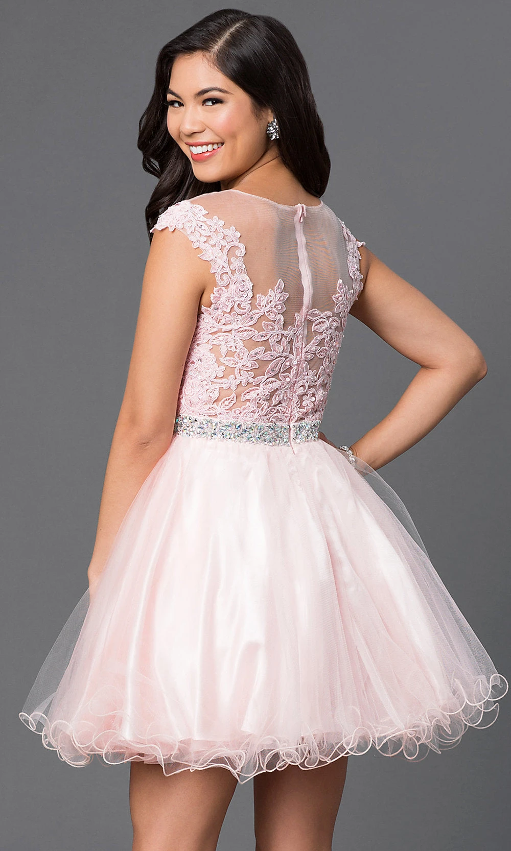 Whimsy and sparkle come together in this short babydoll homecoming dress. Not just for homecoming, this flirty and fun dress shimmers for sweet-16 parties, prom, and other semi-formal to formal events. The cap-sleeve party dress features beaded embroidery on the bodice and a sheer scoop neckline that transfers to the back. A brilliantly beaded waist tops the fully-lined skirt that flows to the trendy rolled hemline in layers of translucent tulle. Offered in misses and extended sizes, this short babydoll homecoming dress is the dress to dazzle on your memorable night.