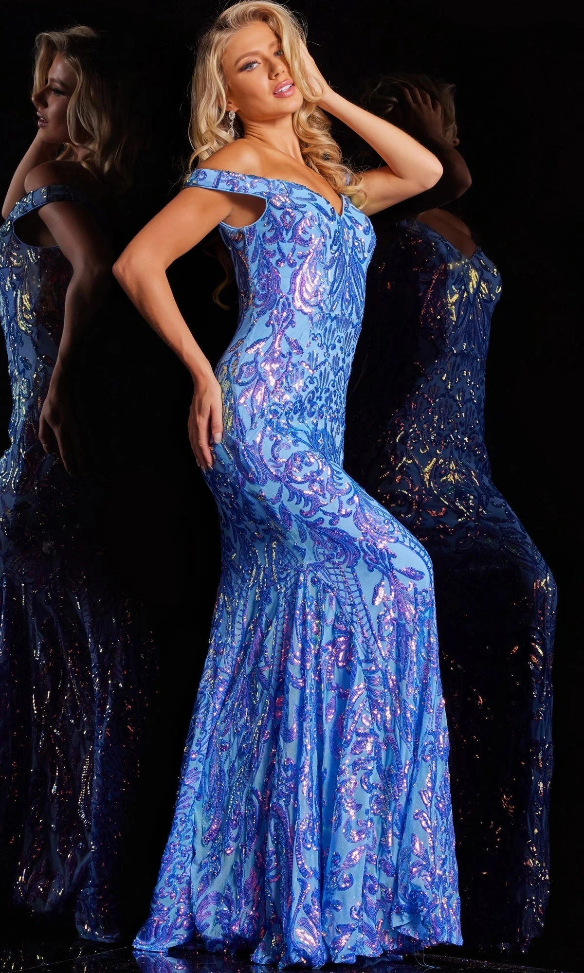 Get ready to turn heads in the stunning Formal Long Dress 23675 by Jovani. This off the shoulder gown features a flattering sweetheart neckline and fitted silhouette, adorned with dazzling sequins for a touch of glamour. Perfect for any formal occasion, this dress will make you feel confident and glamorous all night long.