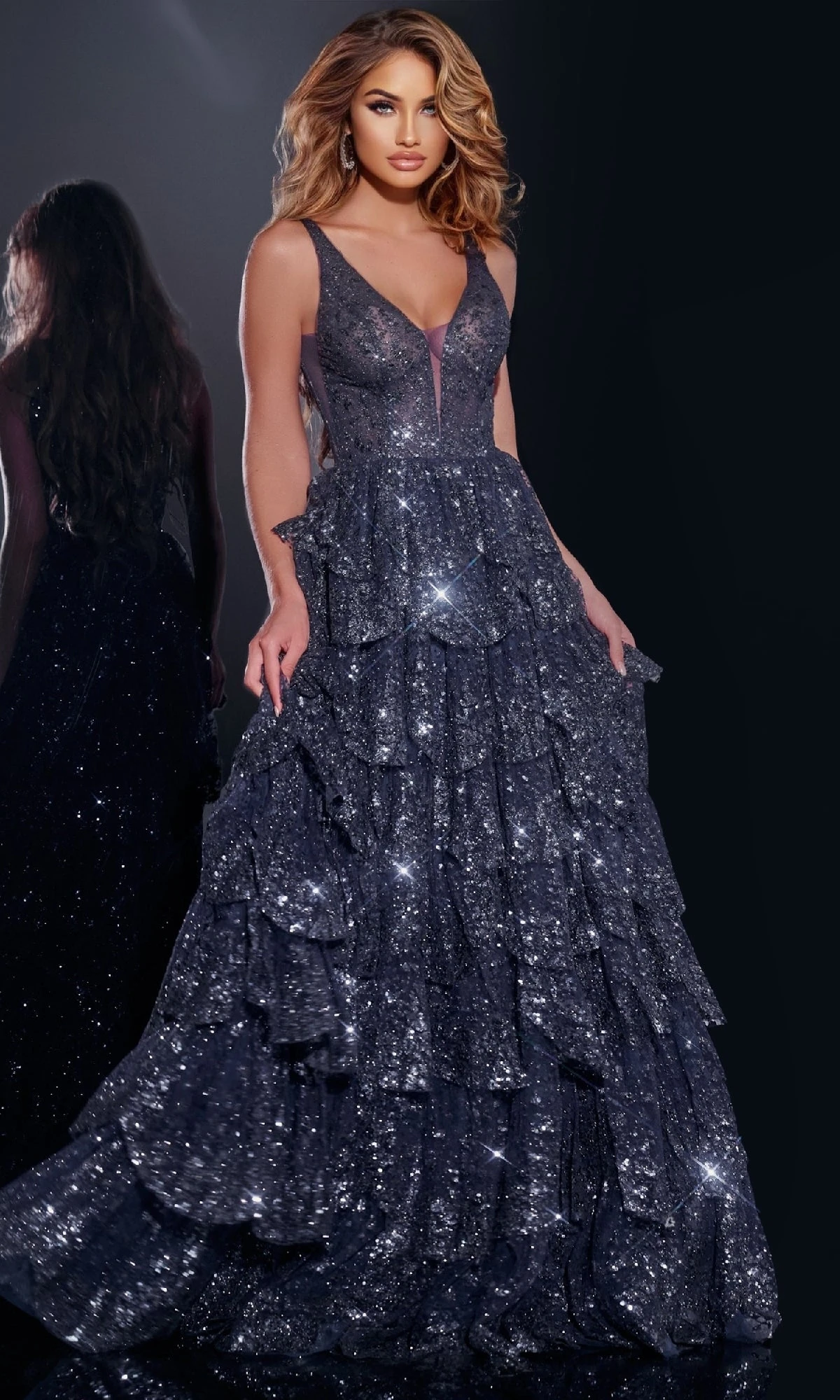 This sleeveless A-line prom dress by Jovani shines with sparkle and features a sheer low V-neck bodice paired with a tiered skirt, offering a graceful and elegant look for your special event.