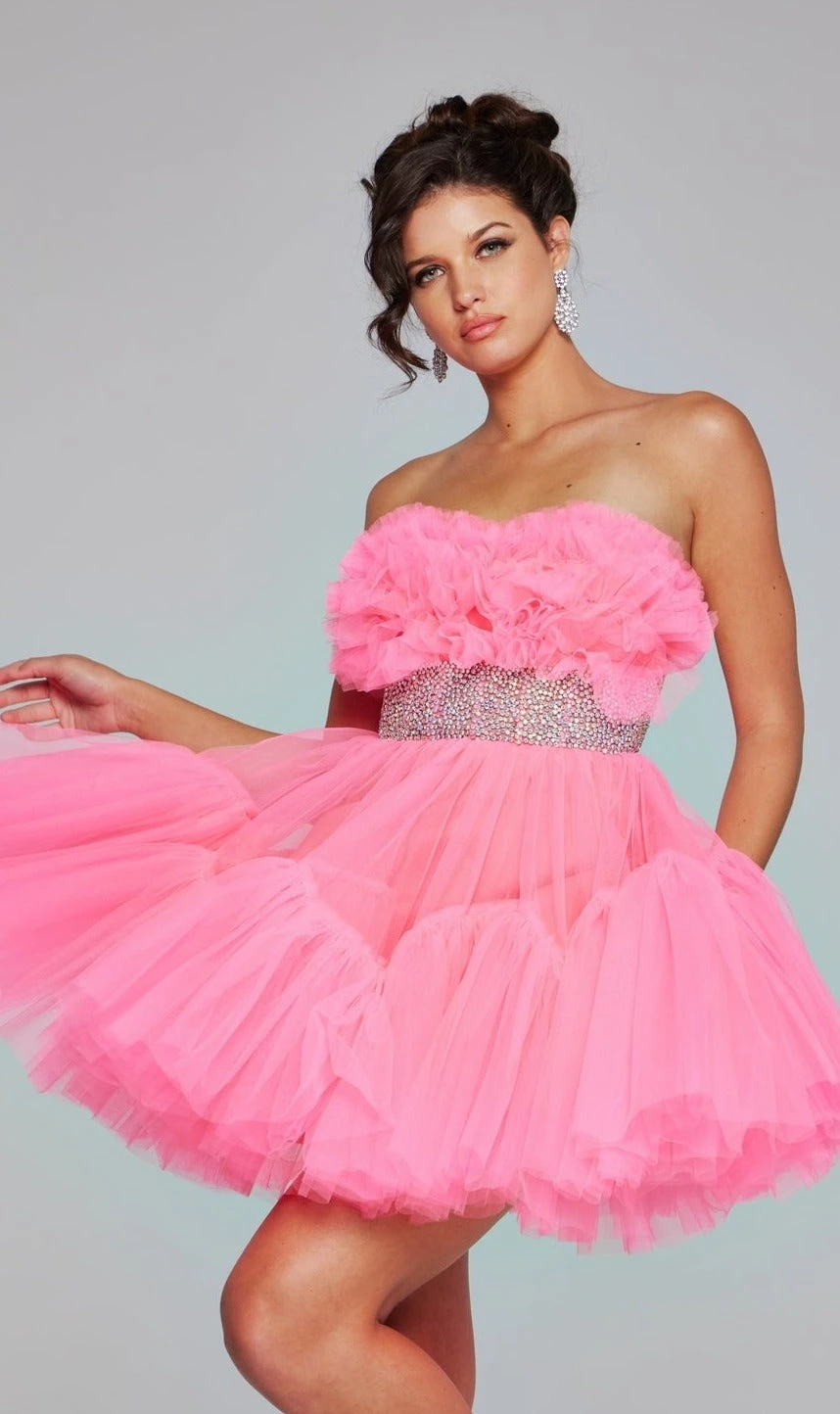 Exude confidence and charm in Jovani’s strapless short ruffle homecoming dress 40186. This stunning designer dress boasts a ruffled sweetheart bodice with an embellished wide waistband that wraps around to the back, creating a flattering silhouette. Perfect for a variety of events, including homecoming and wedding receptions, this strapless short party dress features a fully-lined short skirt with a sheer tulle overlay that cascades into a playful, ruffled hem in an a-line shape. Stand out in this eye-catching and whimsical dress and shine like the star that you are.