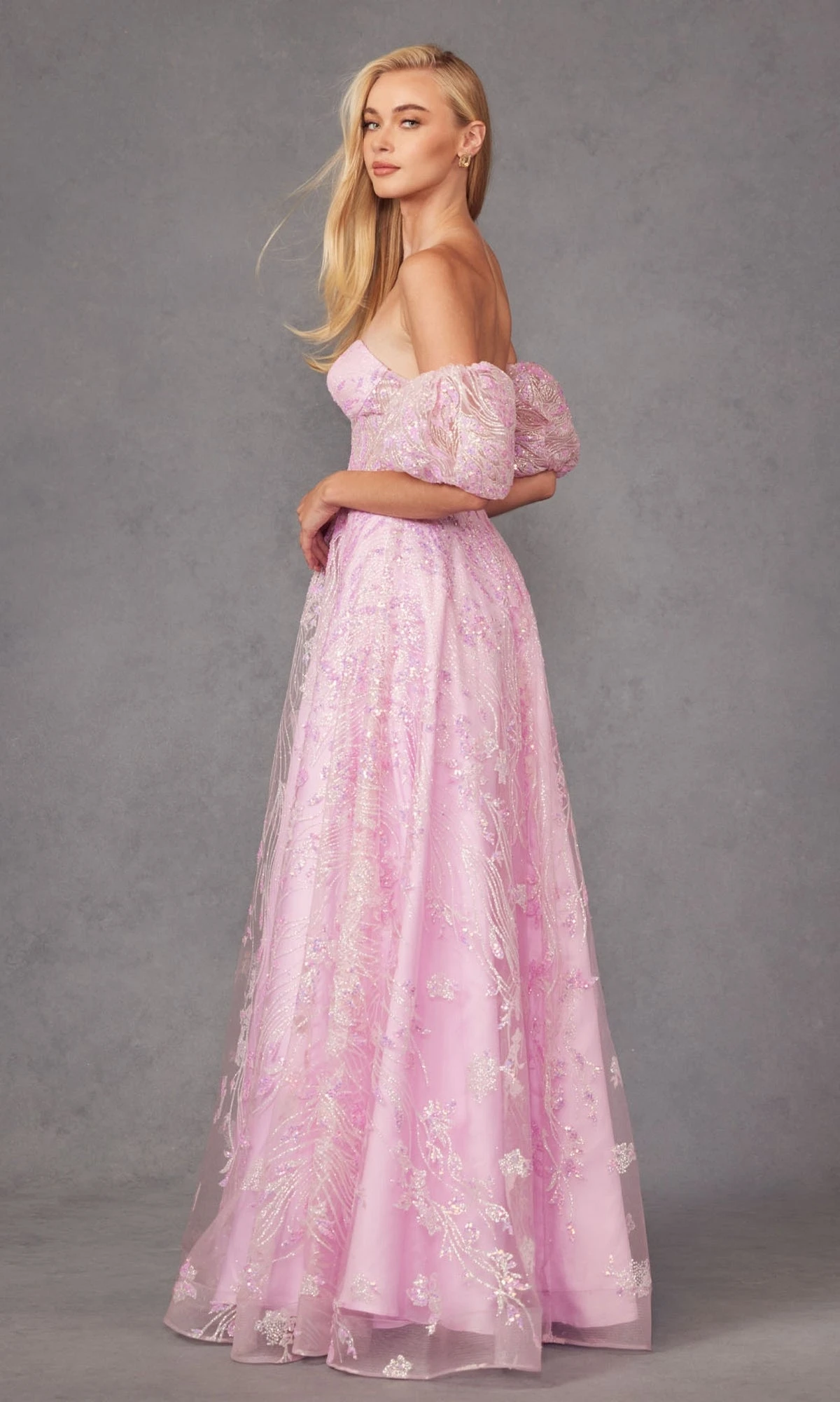This stunning strapless glitter-print Juliet long formal dress offers two versatile looks in one for prom, galas, and other red-carpet events. The short puff sleeves can be easily removed, while the plunging v-neckline and sheer waist add a touch of shimmer. The thin bands lace up the open back for a comfortable fit, and the fully-lined long skirt with a sheer glitter-print overlay flows in an a-line shape to the floor. Available in misses and some plus sizes, this dress is perfect for those who want to make a statement on any special occasion.
