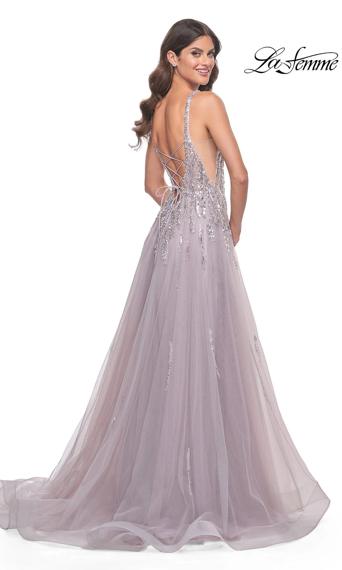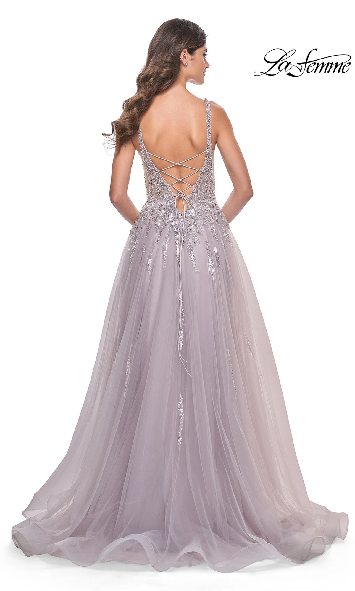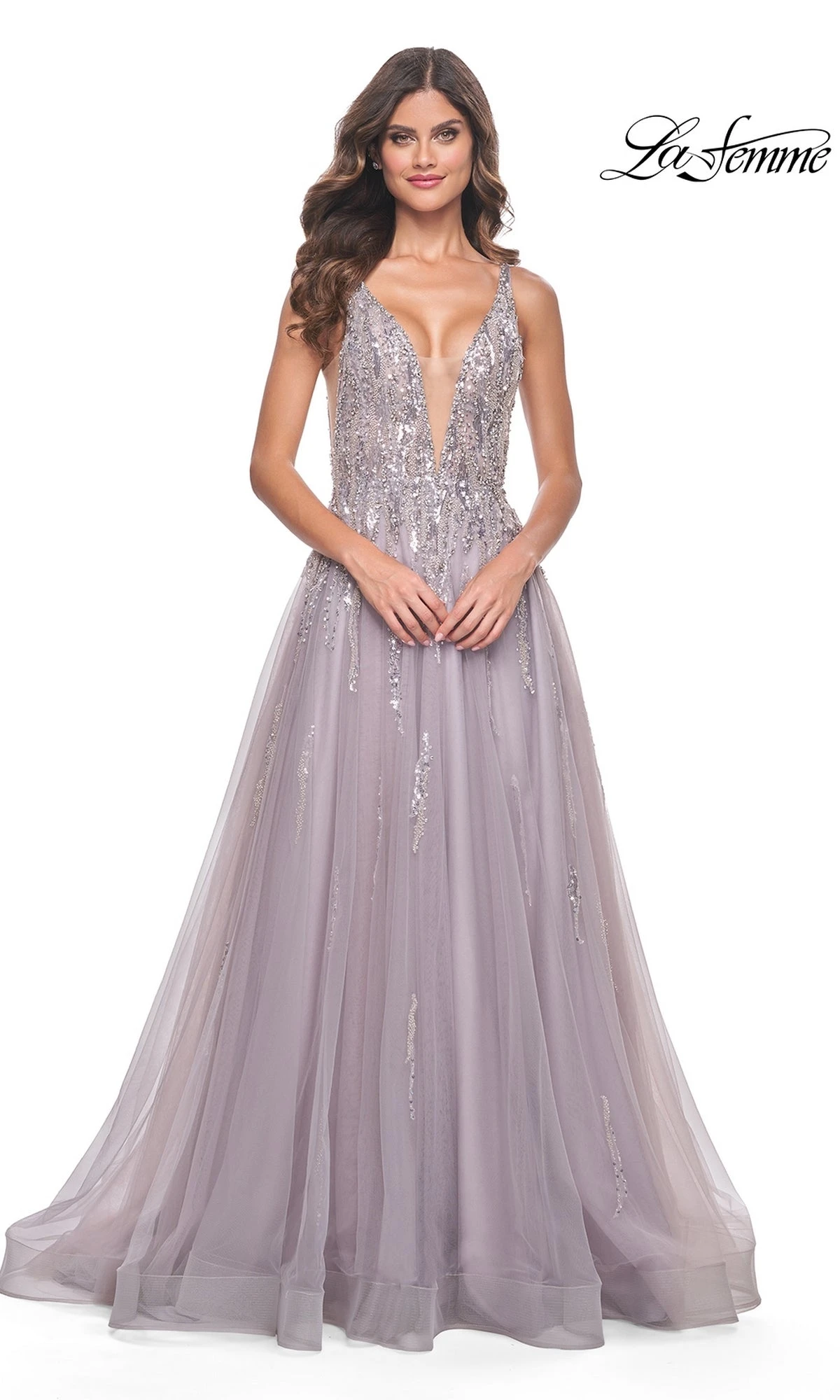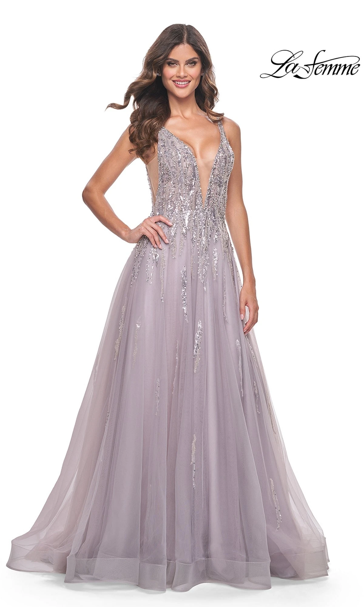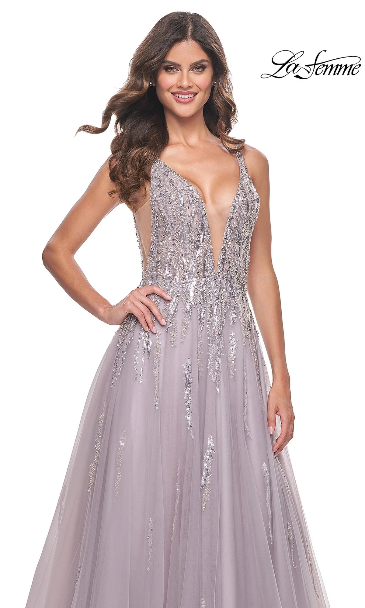 With its long tulle a-line design and plunging neckline, you’ll radiate elegance and confidence all night. The dress also features beautiful sequin embellishments, making you shine and stand out from the crowd. Look and feel like a true prom queen with La Femme.