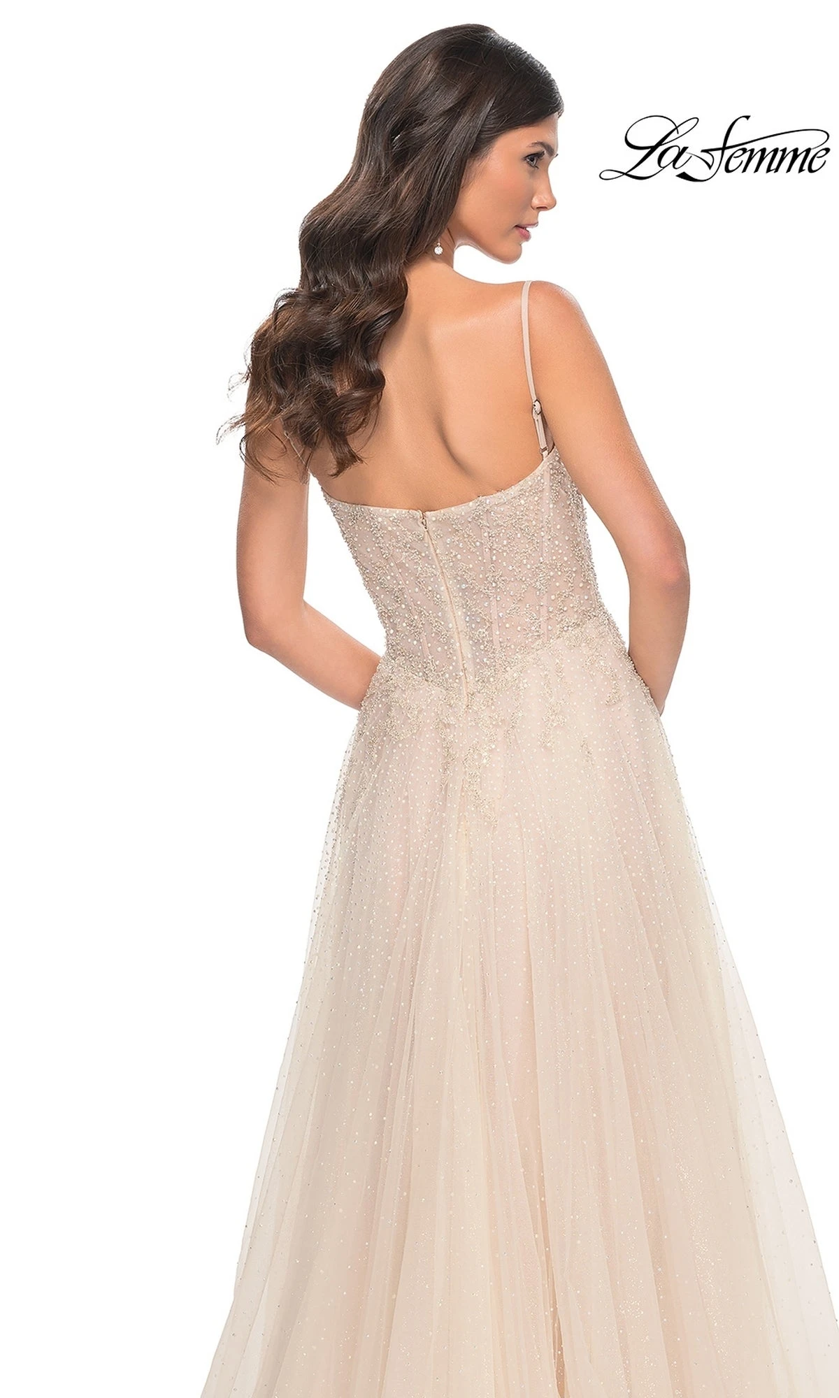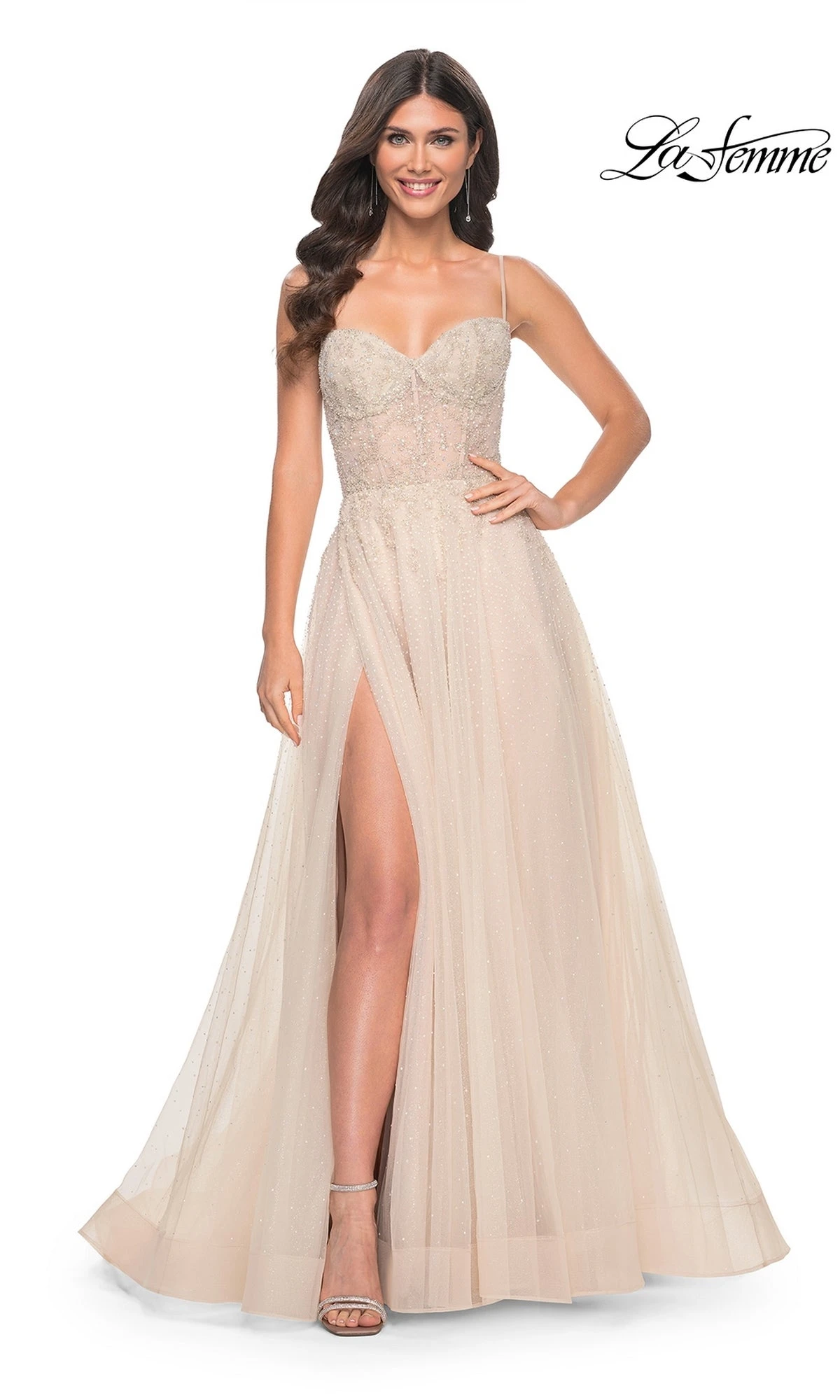 This champagne-colored dress features delicate beaded tulle and a flattering a-line silhouette, accentuated by a sweetheart neckline and sheer bodice. Perfect for any formal occasion, this dress is sure to turn heads and make a lasting impression.