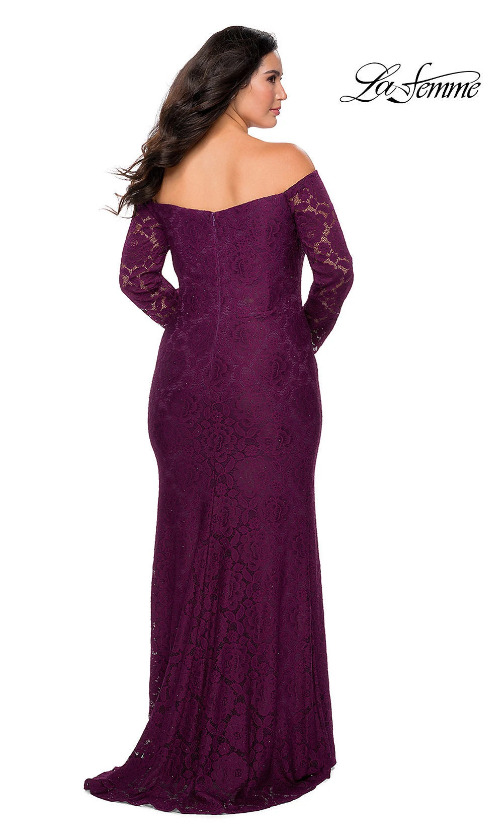 In delicate floral lace, this long plus-size prom dress is an elegant style from the La Femme Curve collection. The beautiful off-the-shoulder plus-size gown features sheer lace long sleeves that provide alluring coverage. Fully lined, the long lace formal dress smooths over the curves before ending in a small train. Dramatic, yet beautiful for prom, this long plus-size prom dress is also a feast for the eyes for other formal dances.