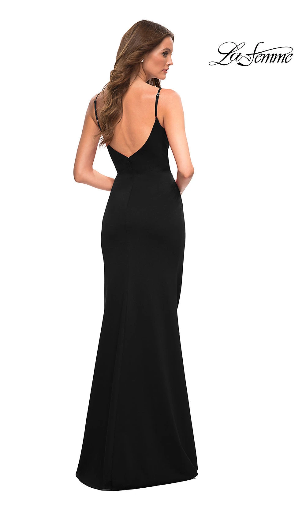 La Femme presents this simple long prom dress that is as slinky as it is sophisticated. The long designer formal dress is crafted in soft jersey from the v-neckline to the floor for a curve-hugging look at prom, a military ball, or another black-tie dance. With a princess cut, this elegant evening gown has thin shoulder straps that are fully adjustable before attaching to the deep scoop-back detail. The hip-skimming long skirt opens in a side slit for a flirty look before ending at the floor. Phenomenal for the girl who loves a simple, yet beautiful style, this modern long prom dress is sure to be a new favorite in your formal wardrobe.