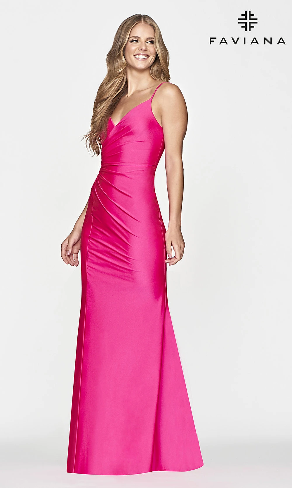 From the designers at Faviana, this long pink prom dress is hot, hot, hot! In vibrant hot pink stretch charmeuse fabric, this gorgeous formal dress is an eye-catching choice for prom and other fancy formals events. Along with a surplice v-neckline, this stunning evening gown features side ruching that makes it look as though it was custom made just for your curves. Thin spaghetti straps add support to this elegant long dress before criss crossing over the open back for a romantic look. Smoothing over the curves before reaching the floor, this long pink prom dress is ready to make your grand entrance an unforgettable one.