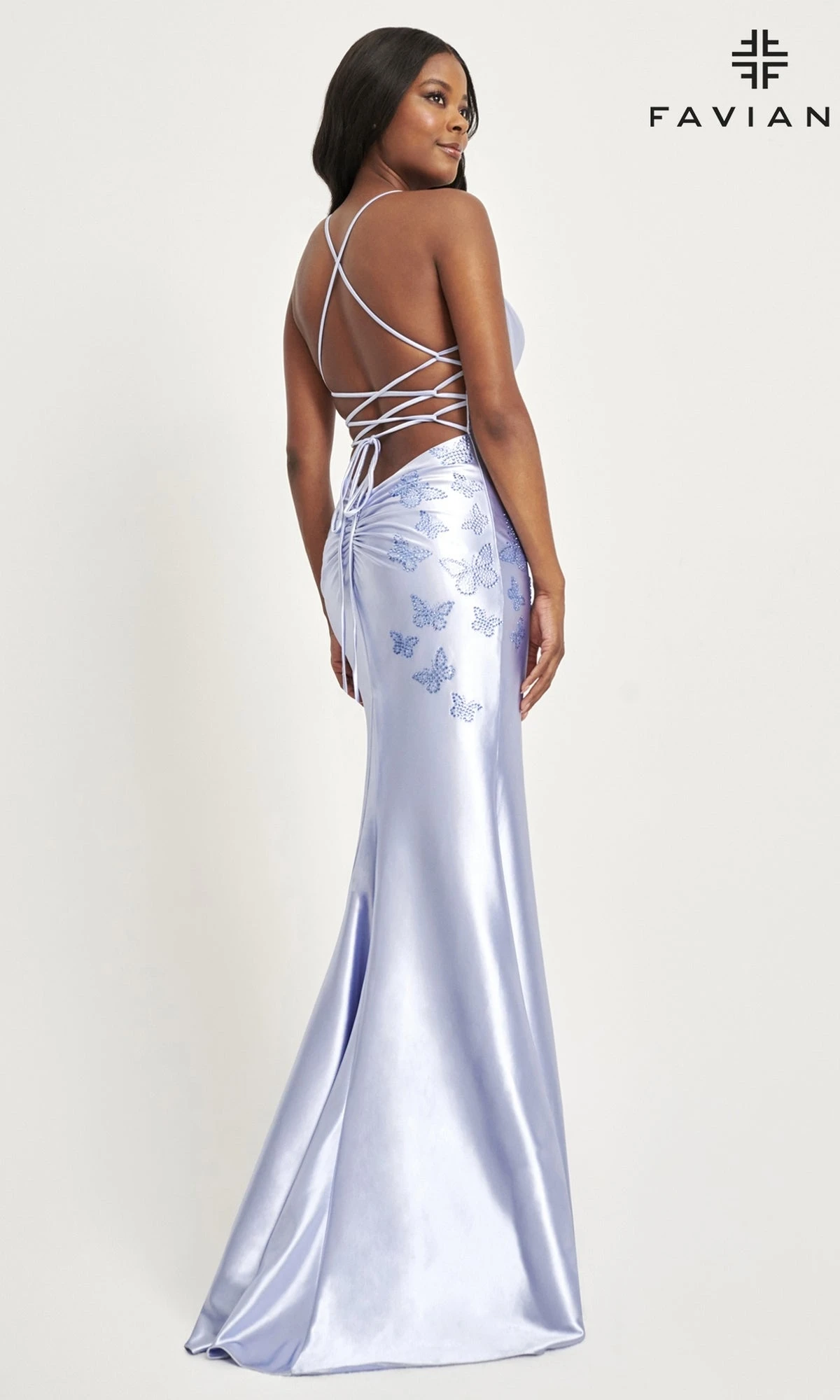 Get ready to dazzle in this sleek long formal dress by Faviana! Crafted with shimmering satin fabric, this dress features beaded butterflies that flow diagonally on the v-neck bodice and hip. With adjustable thin shoulder straps and a side slit, you’ll be the star of any prom or black-tie event. A new favorite for butterfly lovers!