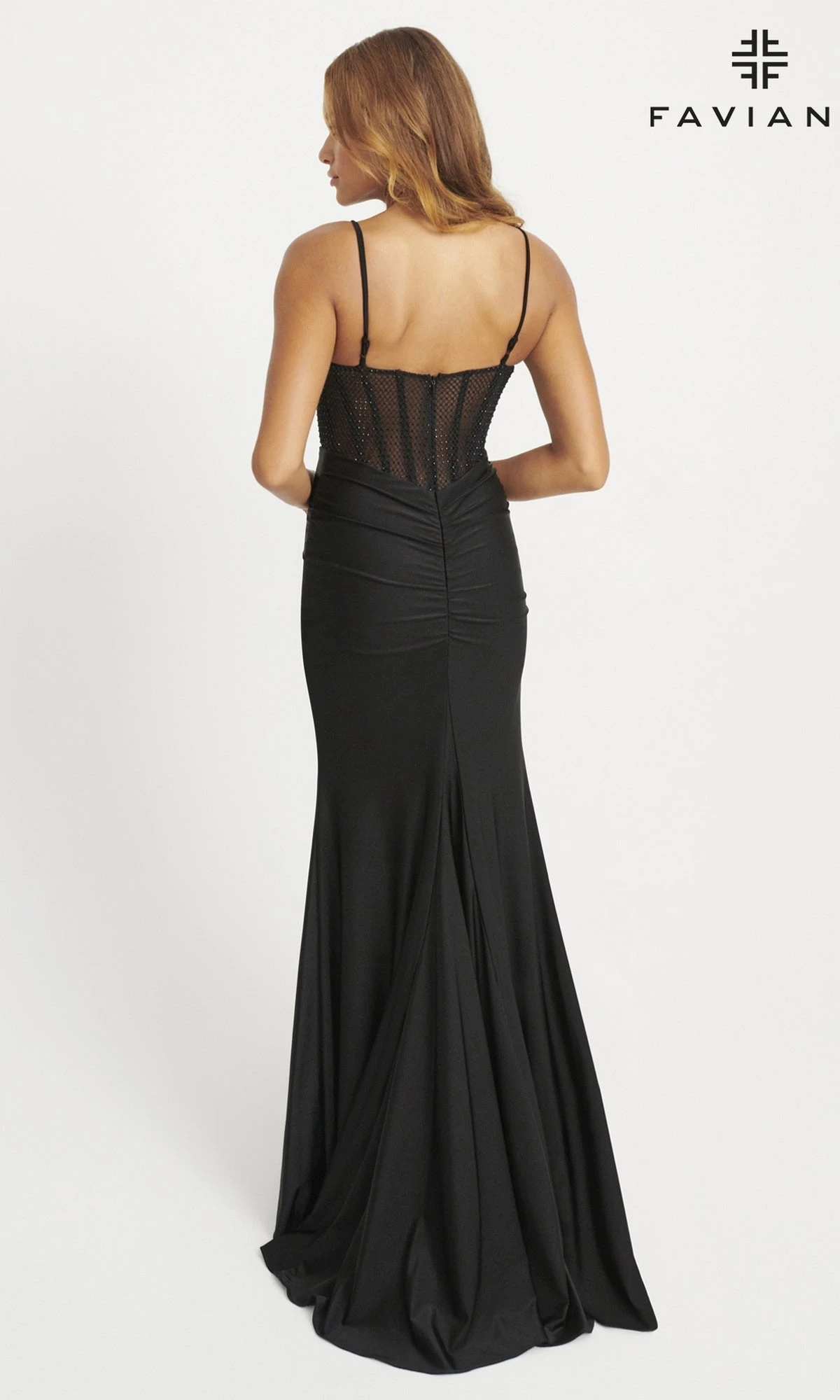 Step onto the red carpet in this stunning Faviana long formal dress. With a shimmering sheer corset-style waist and delicate ruching, this dress accentuates your curves in all the right places. The back godet and small train add a touch of drama to this classic, yet eye-catching look. Ideal for proms, galas, and other formal events. Available in misses and plus sizes.