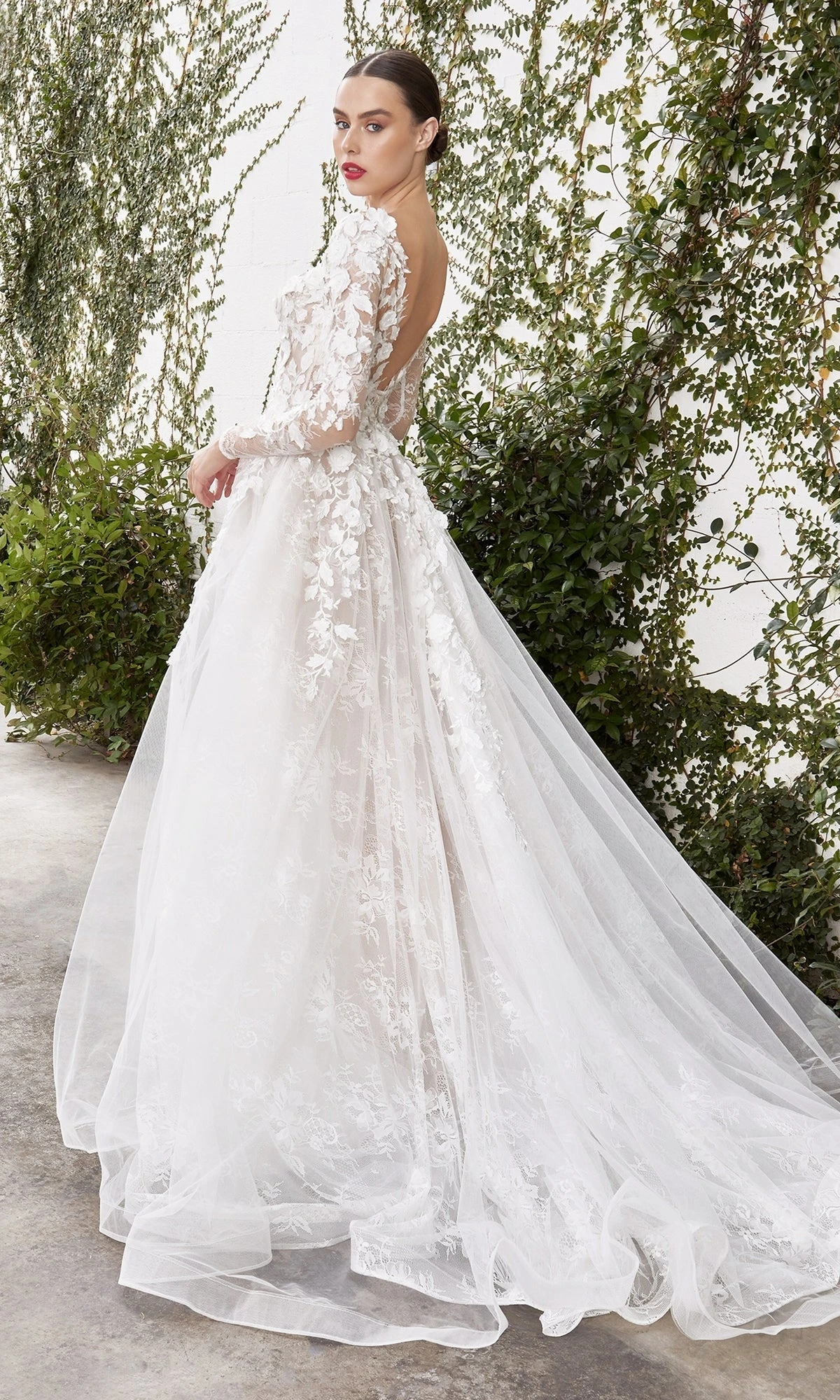 Long sleeve a-line off white over nude formal ball gown with floral applique.