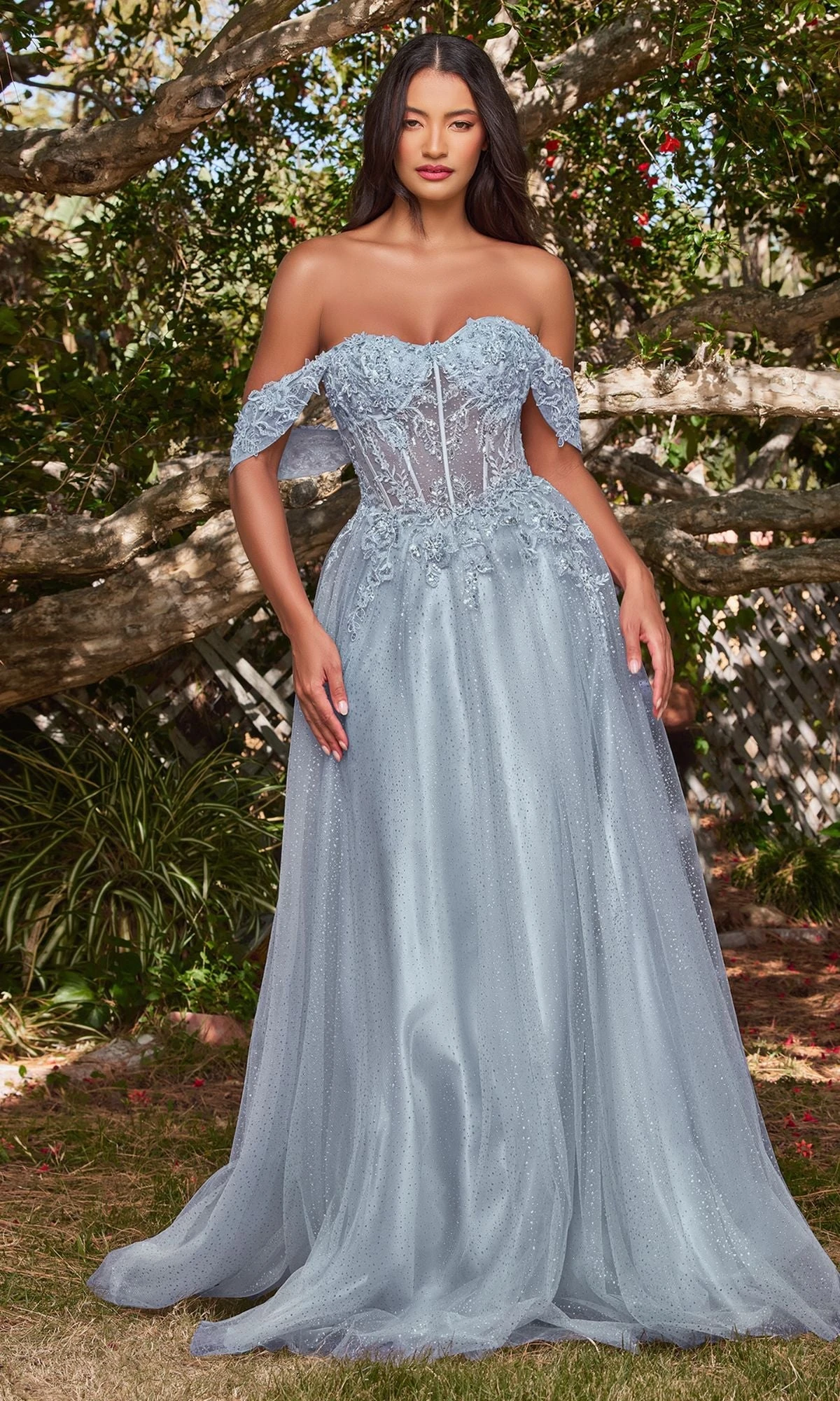 Long off the shoulder glitter formal a-line ball gown with sweetheart neckline.