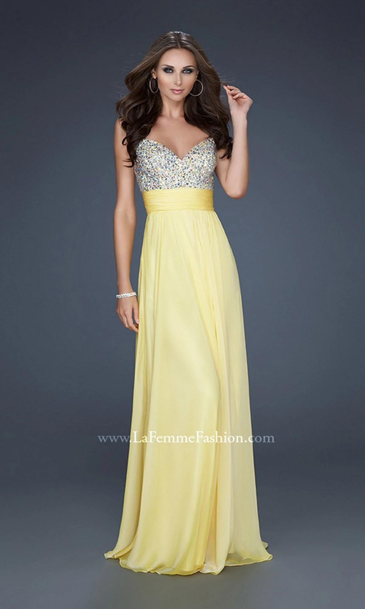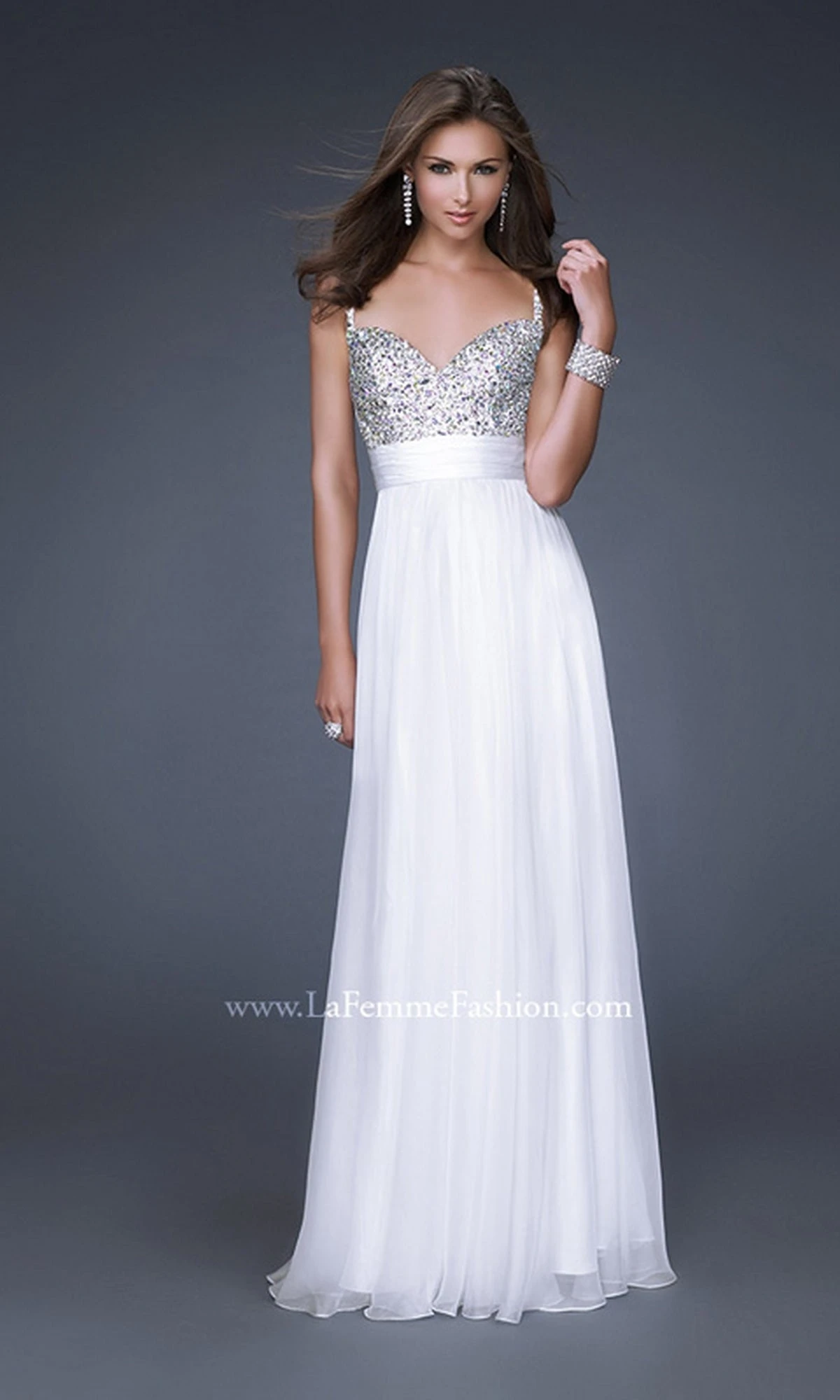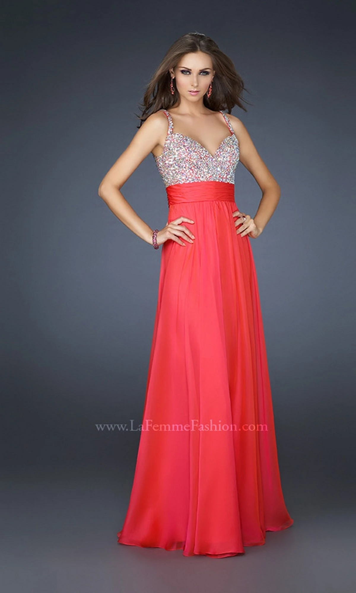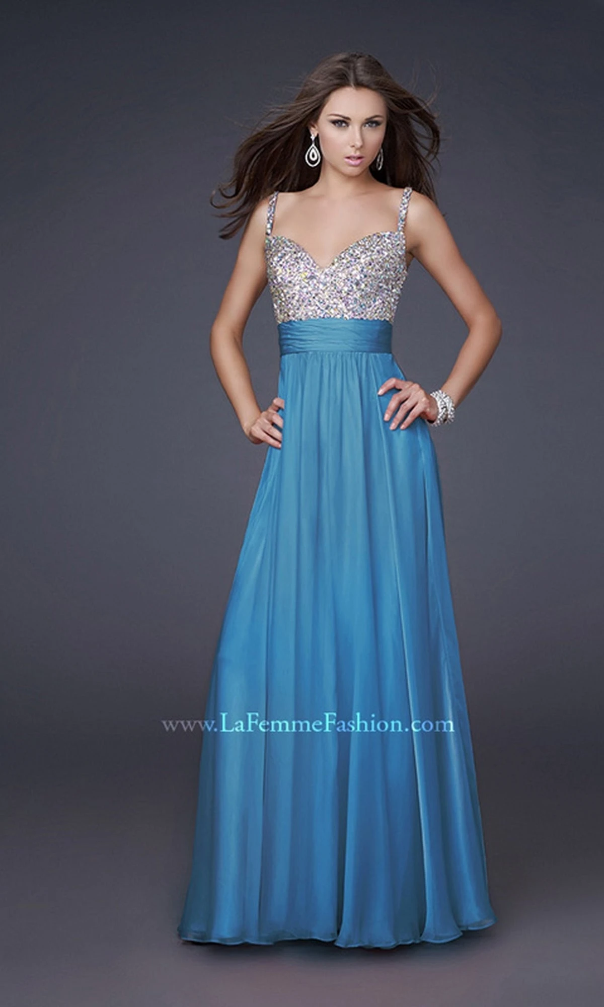 Long flowing chiffon La Femme prom dress with beaded bodice