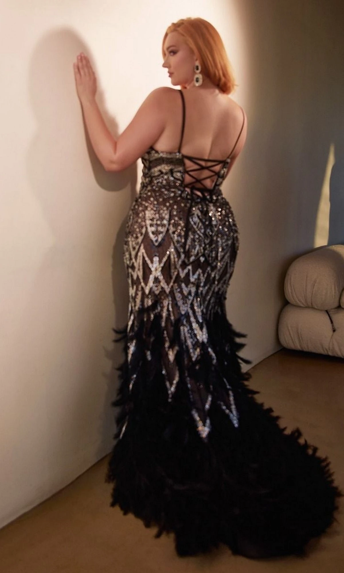 Get ready to turn heads in this stunning long plus-size formal dress by Andrea and Leo. The deep v-neckline and intricate beaded design will have you shimmering with every step, while the feathered mermaid skirt adds a touch of elegance. With a flattering corset detail and open back, this dress is perfect for proms, galas, and black-tie events.