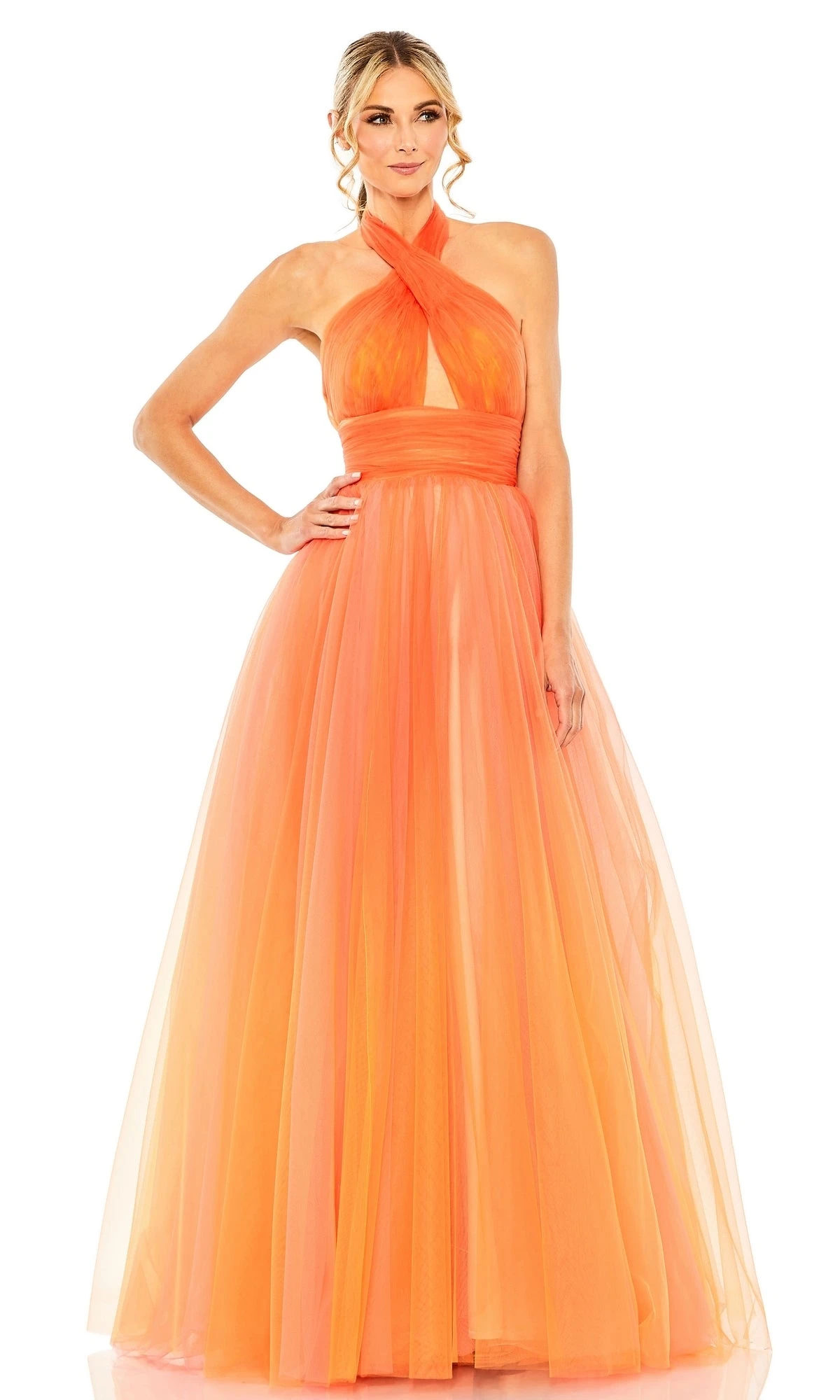 Elevate your elegance with this striking ombre ball gown. The crisscross halter neckline and empire waist effortlessly flatter your figure, ensuring you will captivate the audience’s attention. This glamorous outfit will make you feel like the belle of the ball.