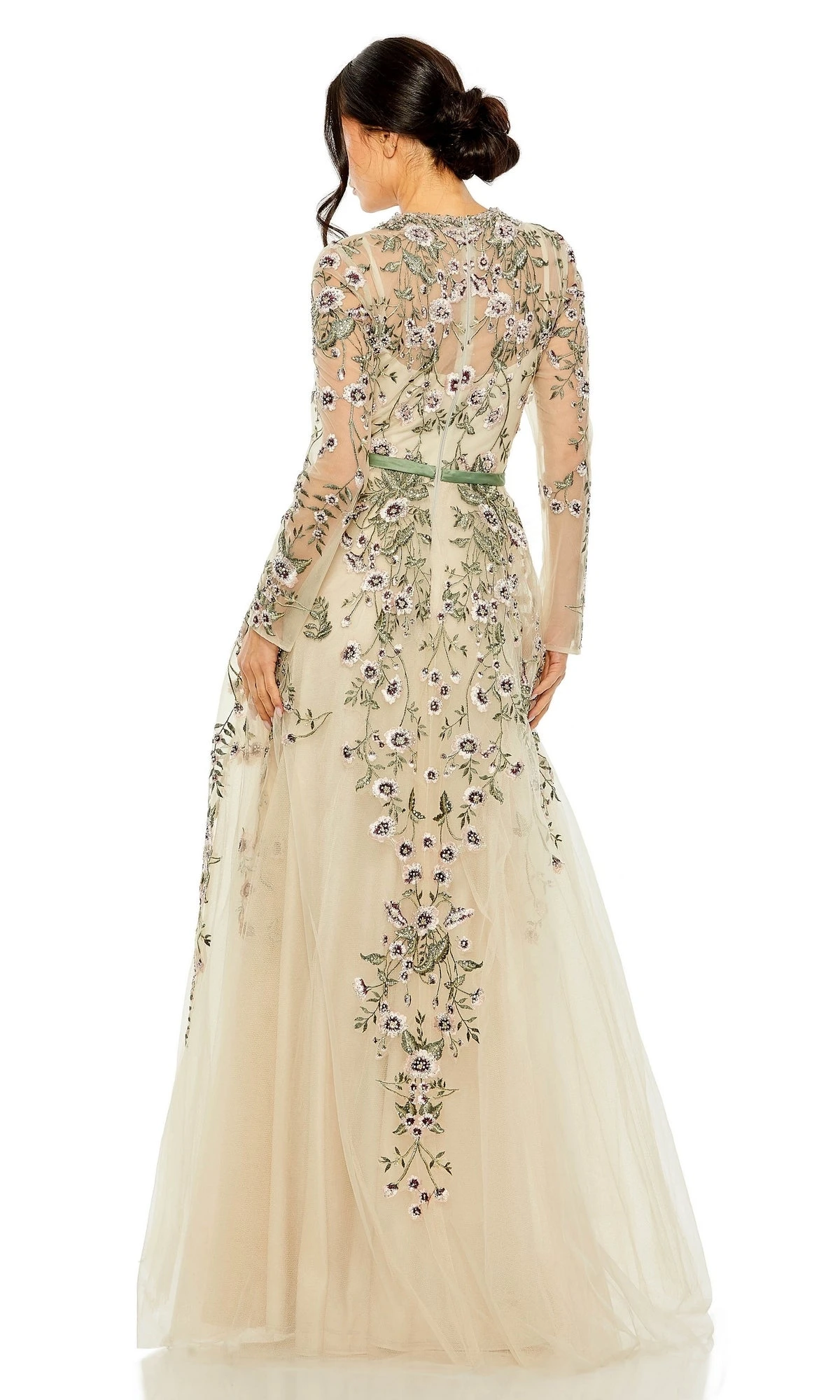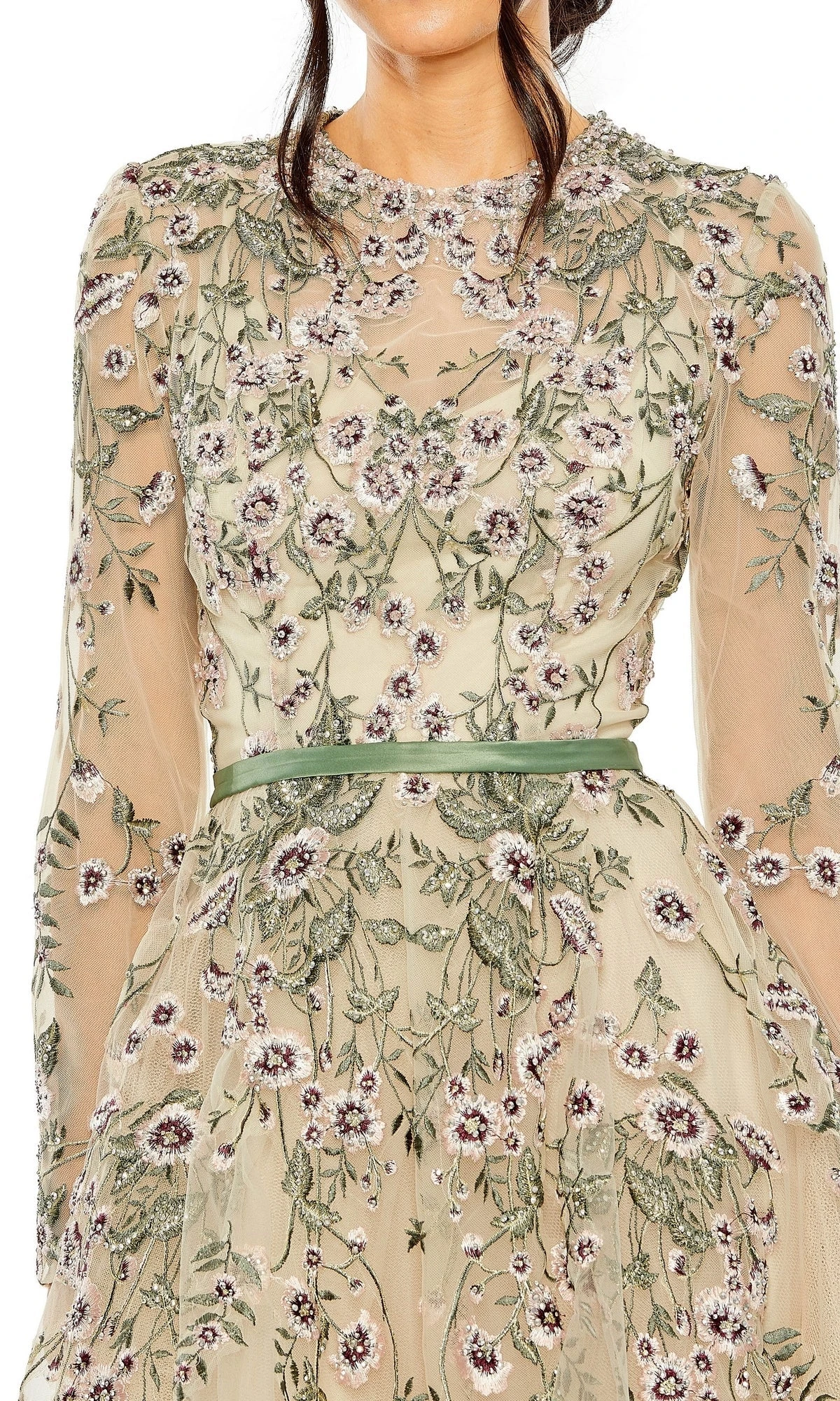 This stunning sage green dress features delicate sheer long sleeves and intricate embroidery, making it the perfect addition to any formal attire. Get ready to turn heads in this elegant a-line style.