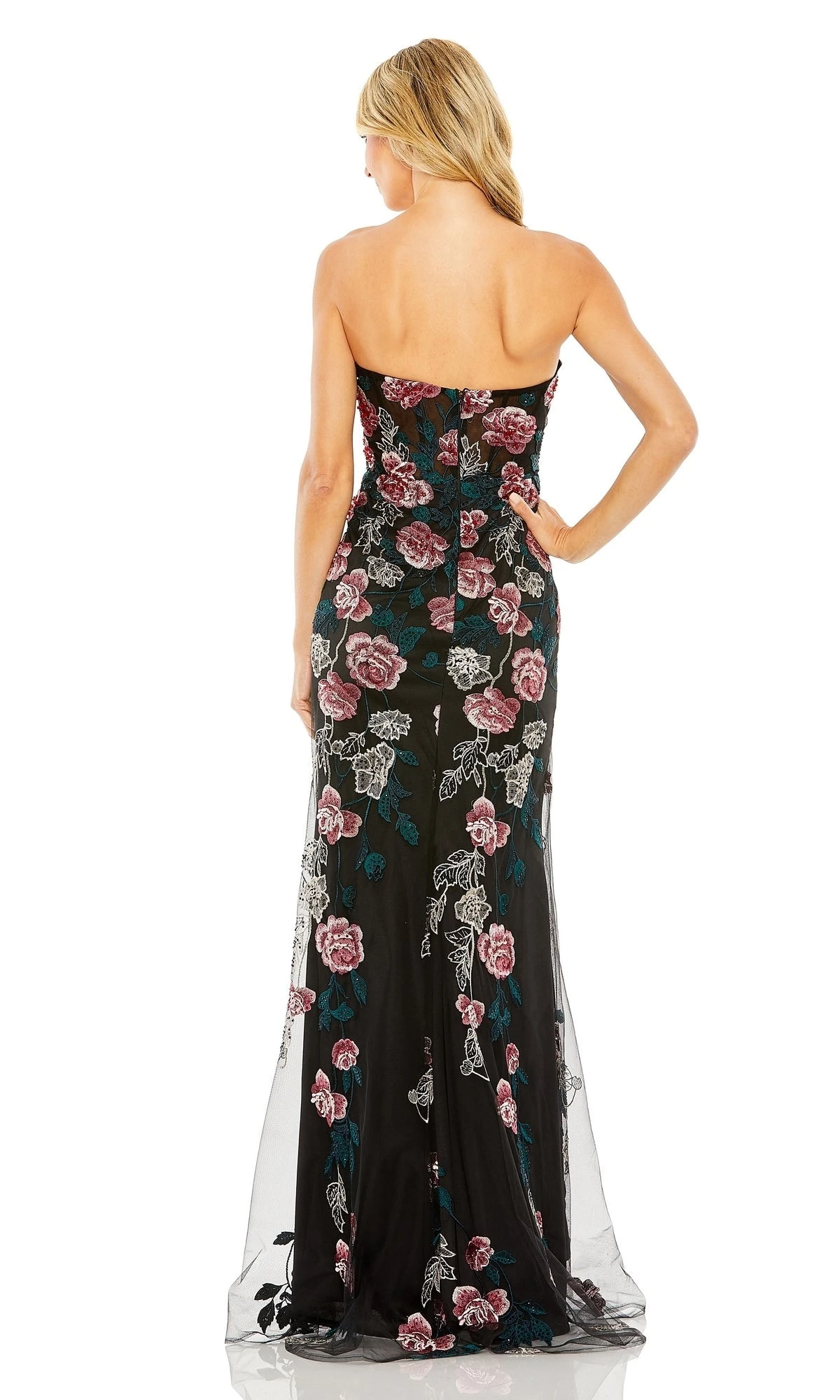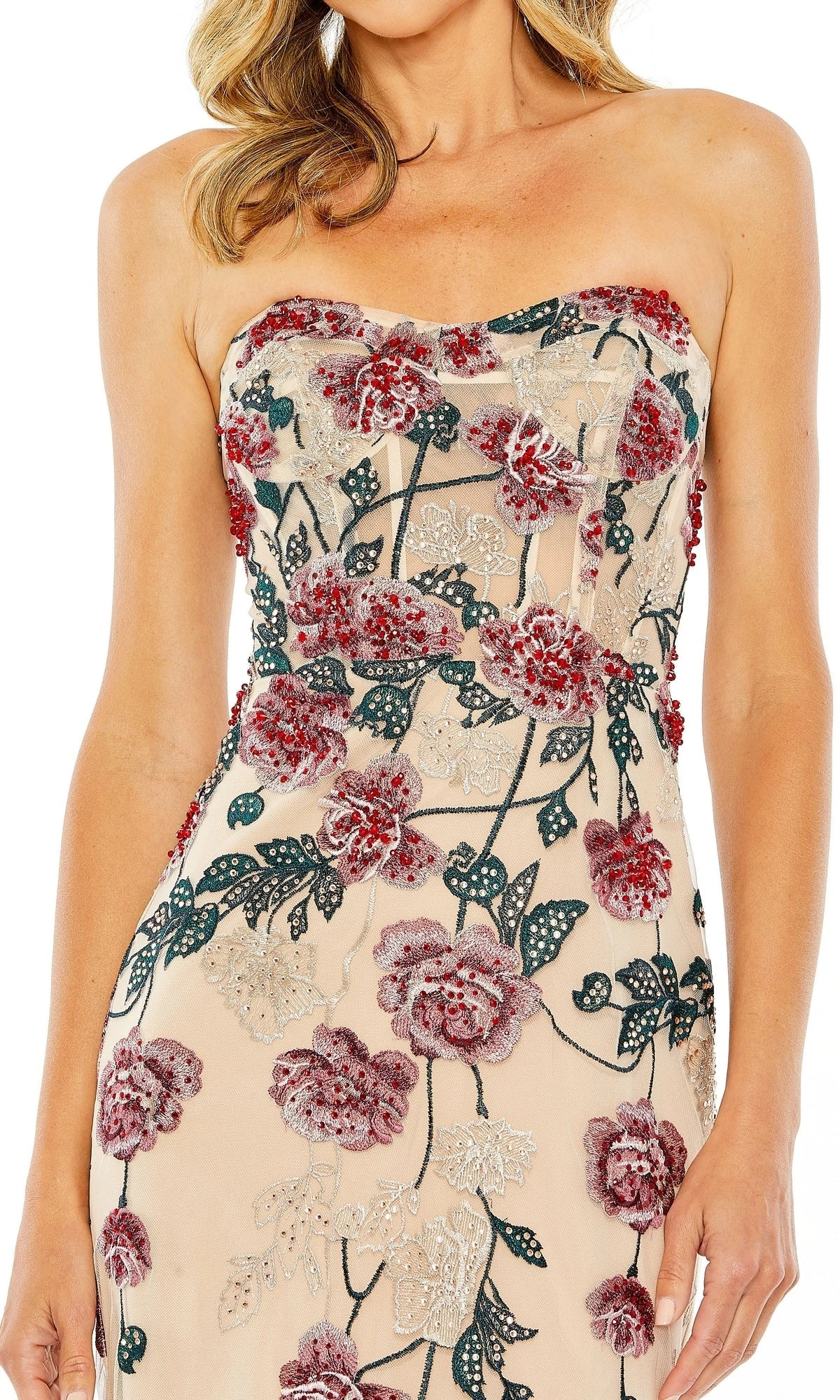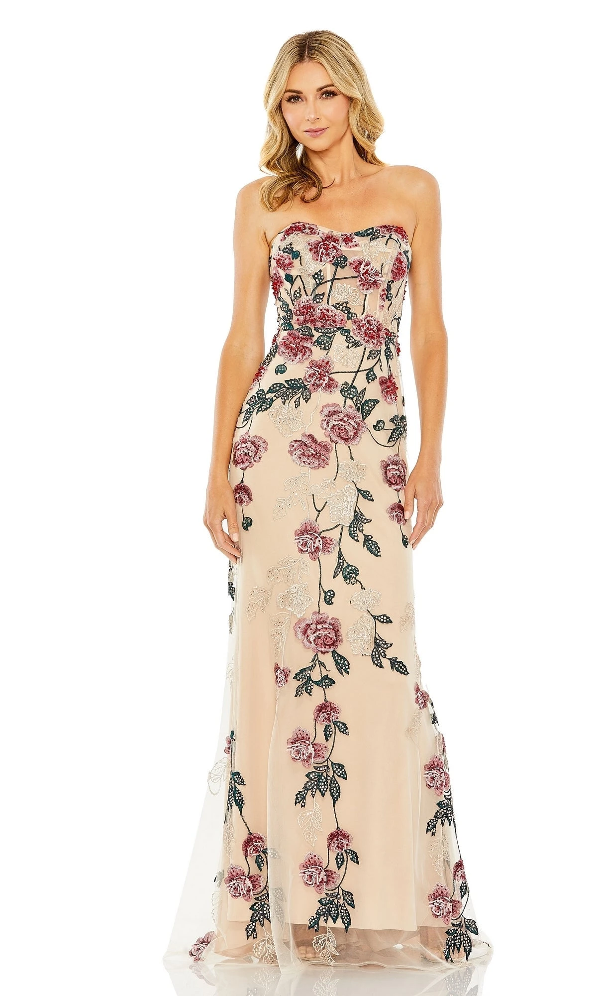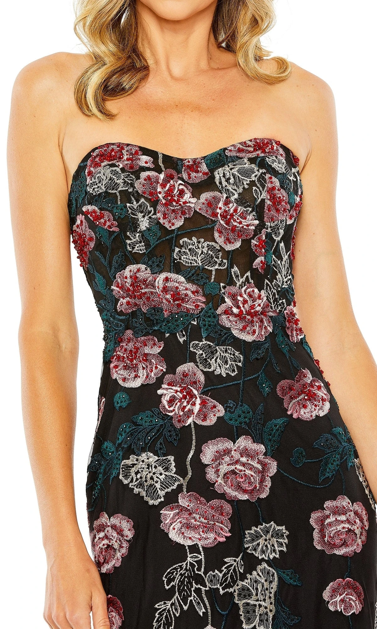 This elegant dress features a strapless sweetheart neckline and a fitted silhouette, adorned with beautiful floral embroidery.