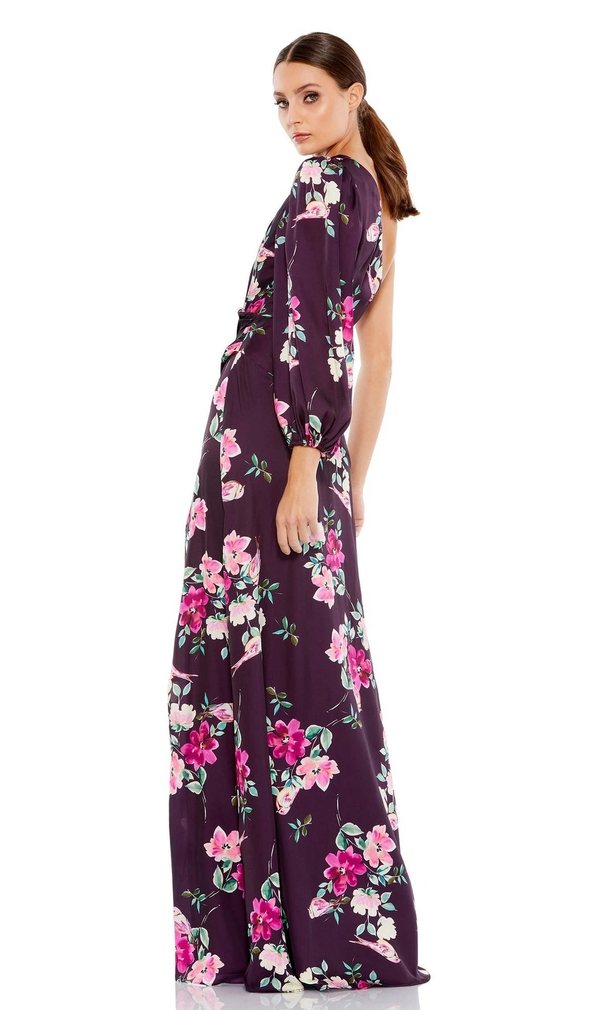 This elegant long formal dress features a stunning plum color with a unique one shoulder design and a beautiful floral print. It also includes long sleeves for added coverage and a sophisticated touch.