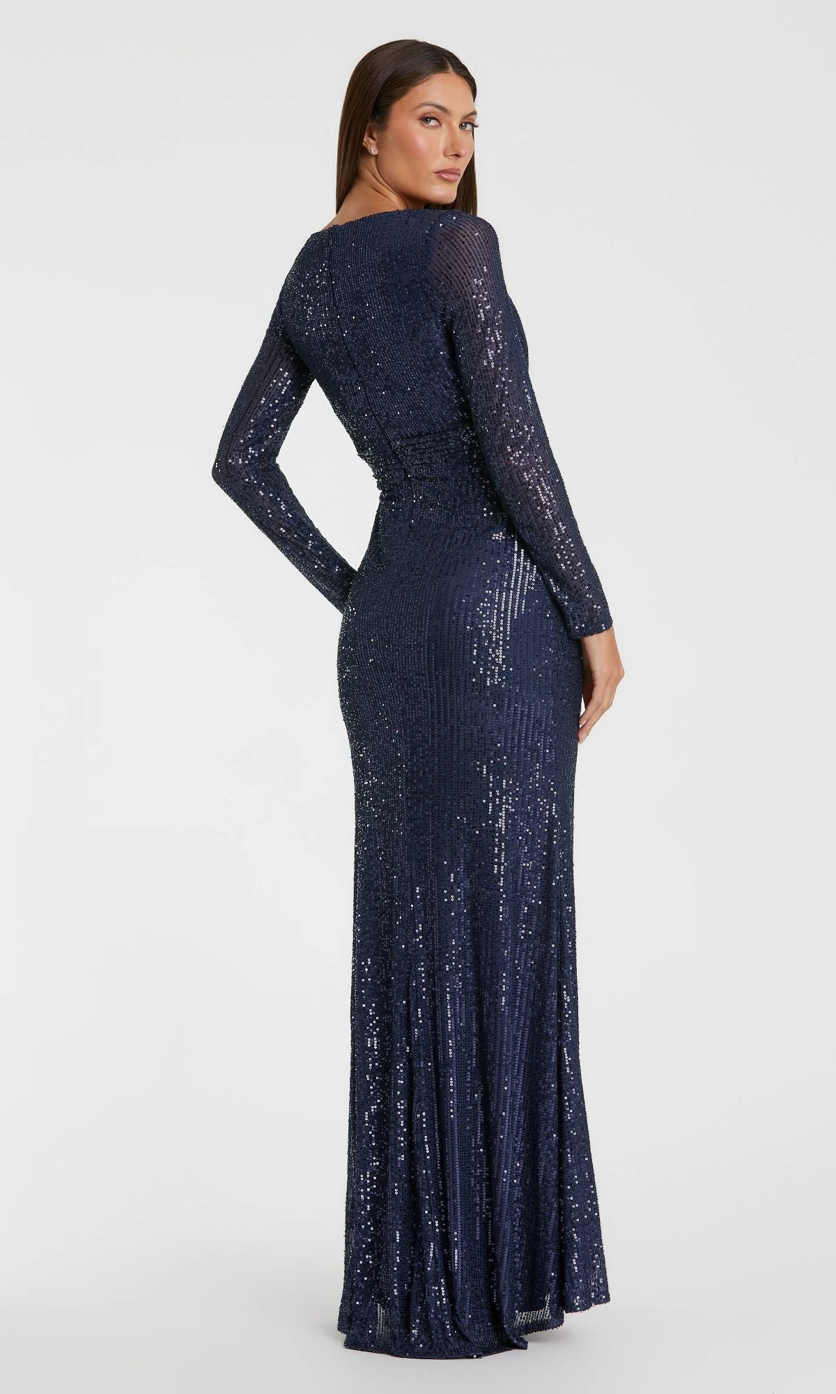 This long sequin dress is fitted and features a v-neckline and empire waist for a flattering look. Designed with a bra-friendly back, it will keep you comfortable and confident all night long.