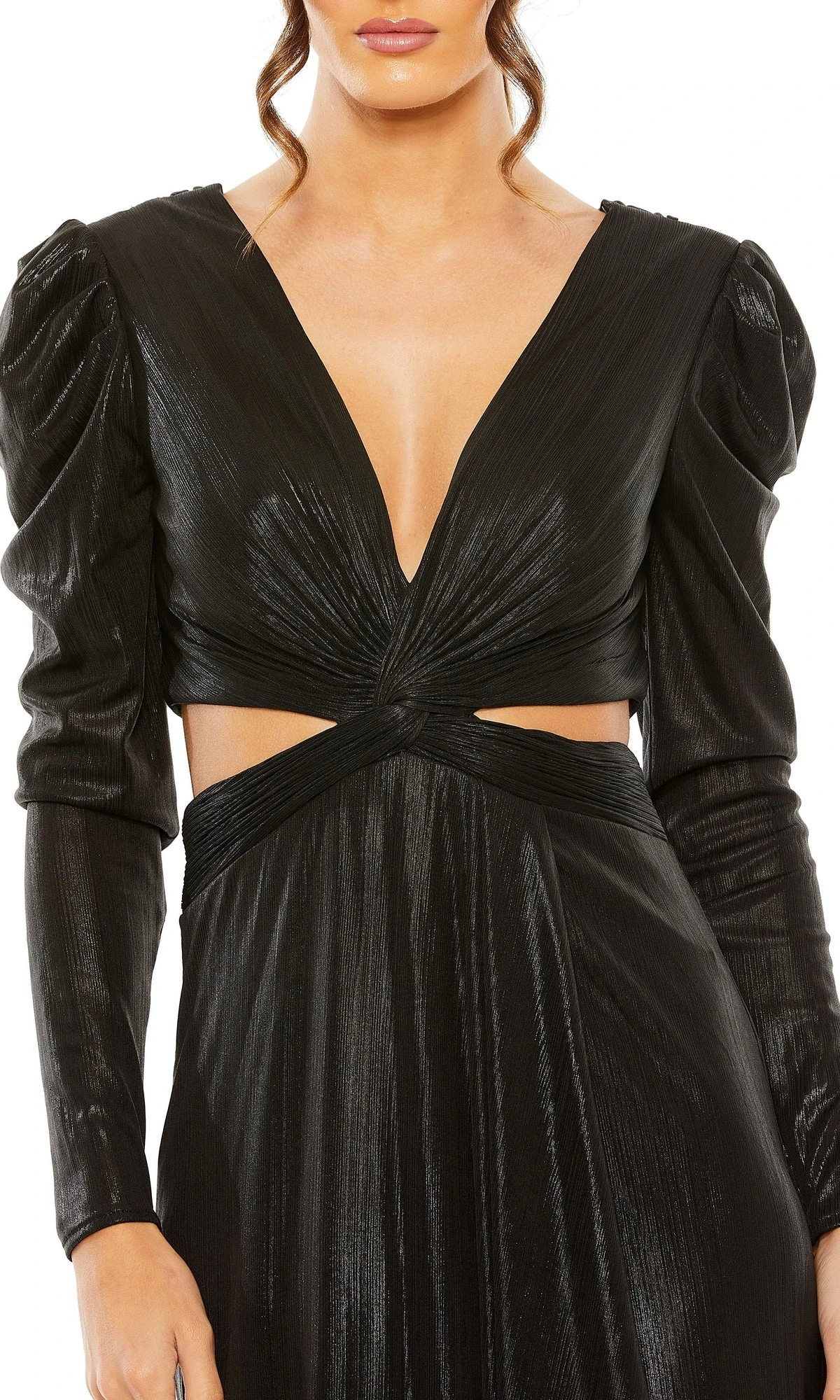 This long metallic formal dress features a cut out design, with a v-neckline and an open back for a stunning and bold look. Its alluring and sophisticated style makes it the perfect choice for any formal occasion. With this dress, you’ll feel confident, beautiful, and ready to make lasting memories.