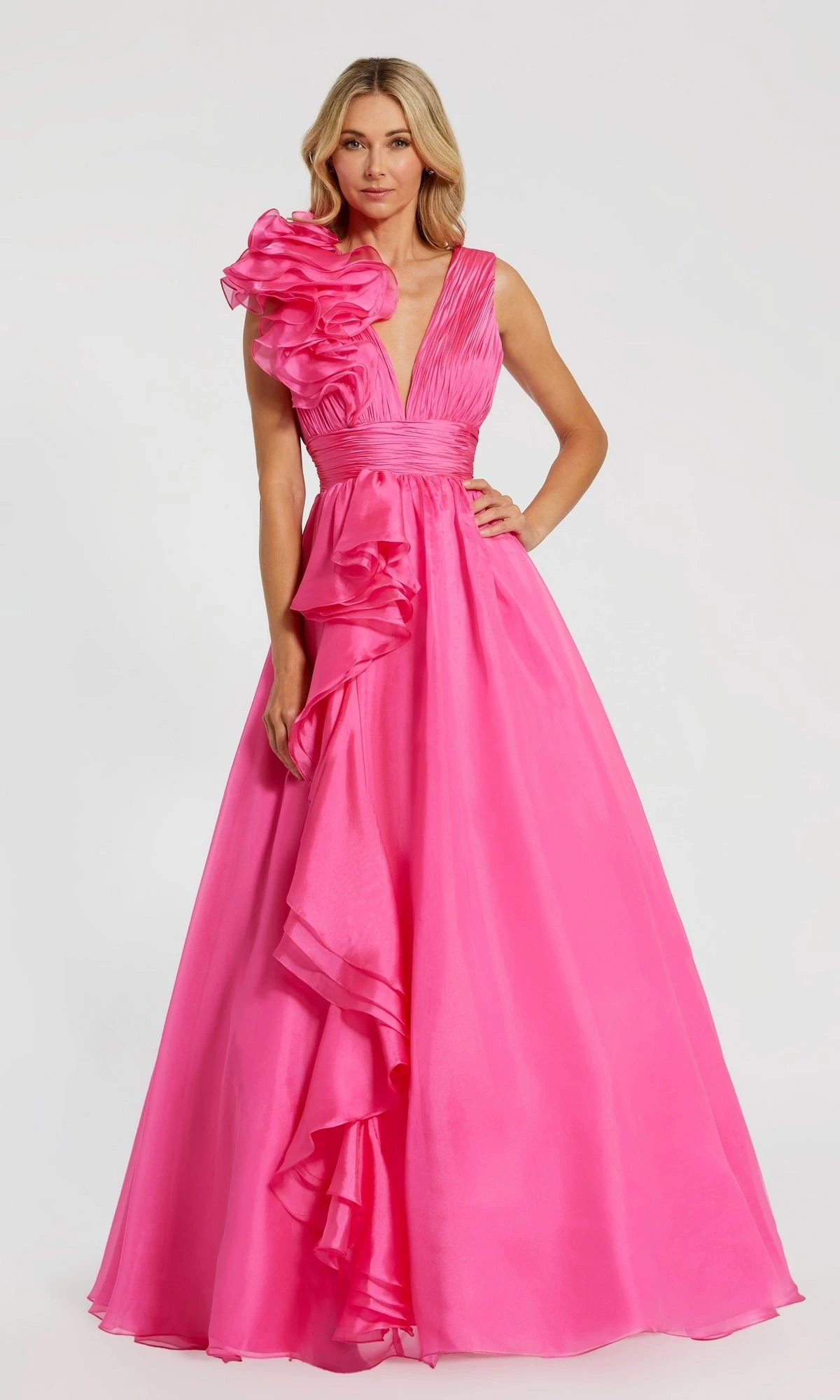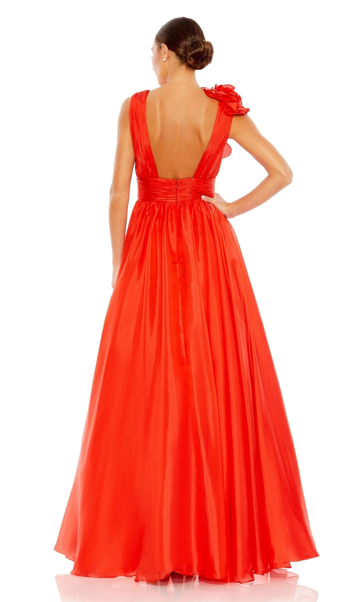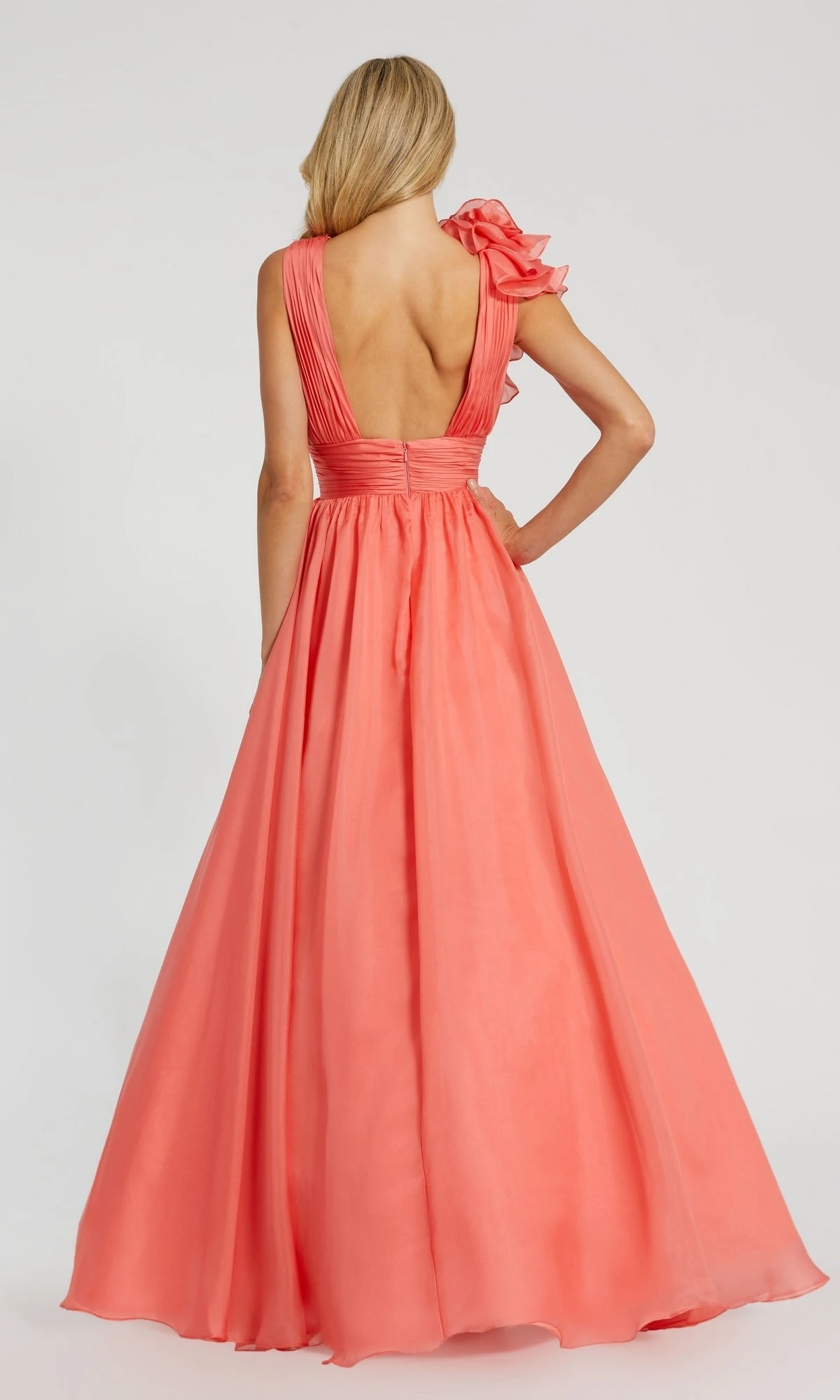 This gorgeous formal dress boasts an a-line design with an empire waist and asymmetrical ruffle detail, perfect for creating a flattering silhouette. The low v-neckline and open back add a touch of allure and sophistication, making it the ideal choice for any special occasion. Feel confident and beautiful in this timeless piece that will make you stand out.