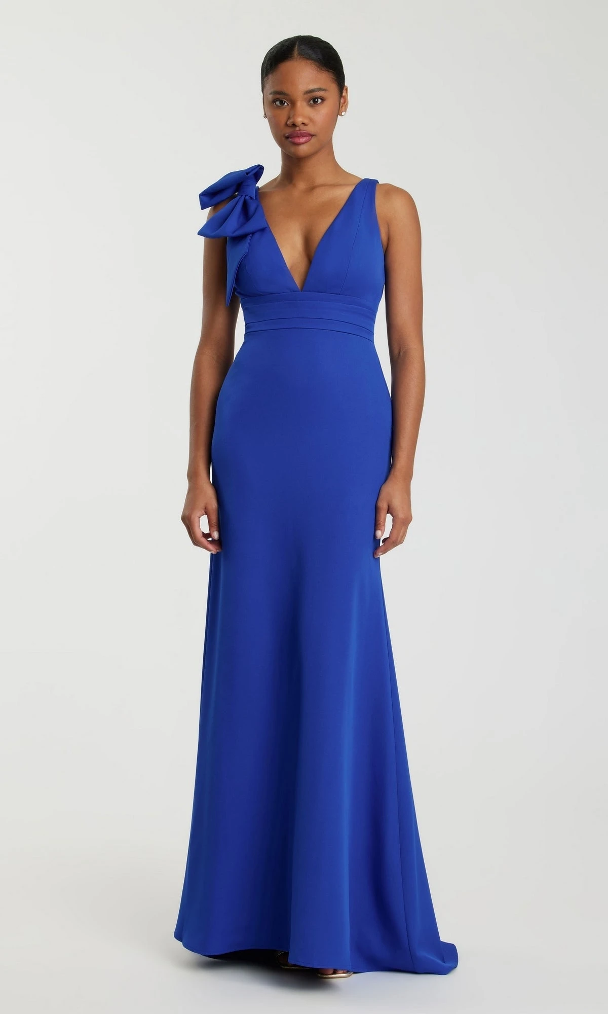 This formal dress features a fitted, floor-length design with a low v-neckline and a charming bow accent at the empire waist. You’ll look and feel confident and sophisticated at your next event. The flattering silhouette and elegant bow detail make this a must-have addition to your wardrobe for any occasion.