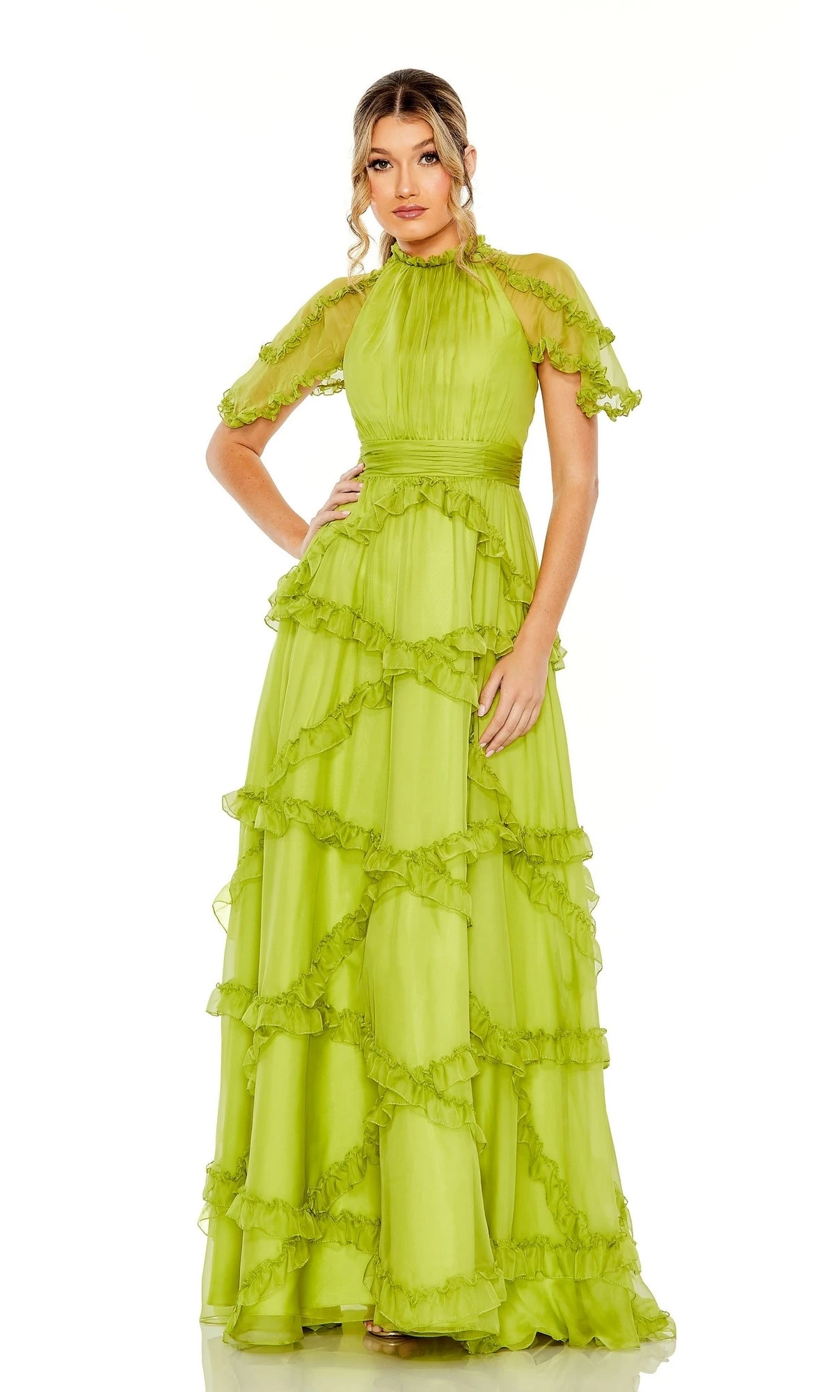 Looking for a stunning formal dress that will make a statement at any event? Look no further than this apple green ruffled a-line dress with short sleeves and a high neckline. Its elegant design flatters all body types, making you stand out from the crowd.