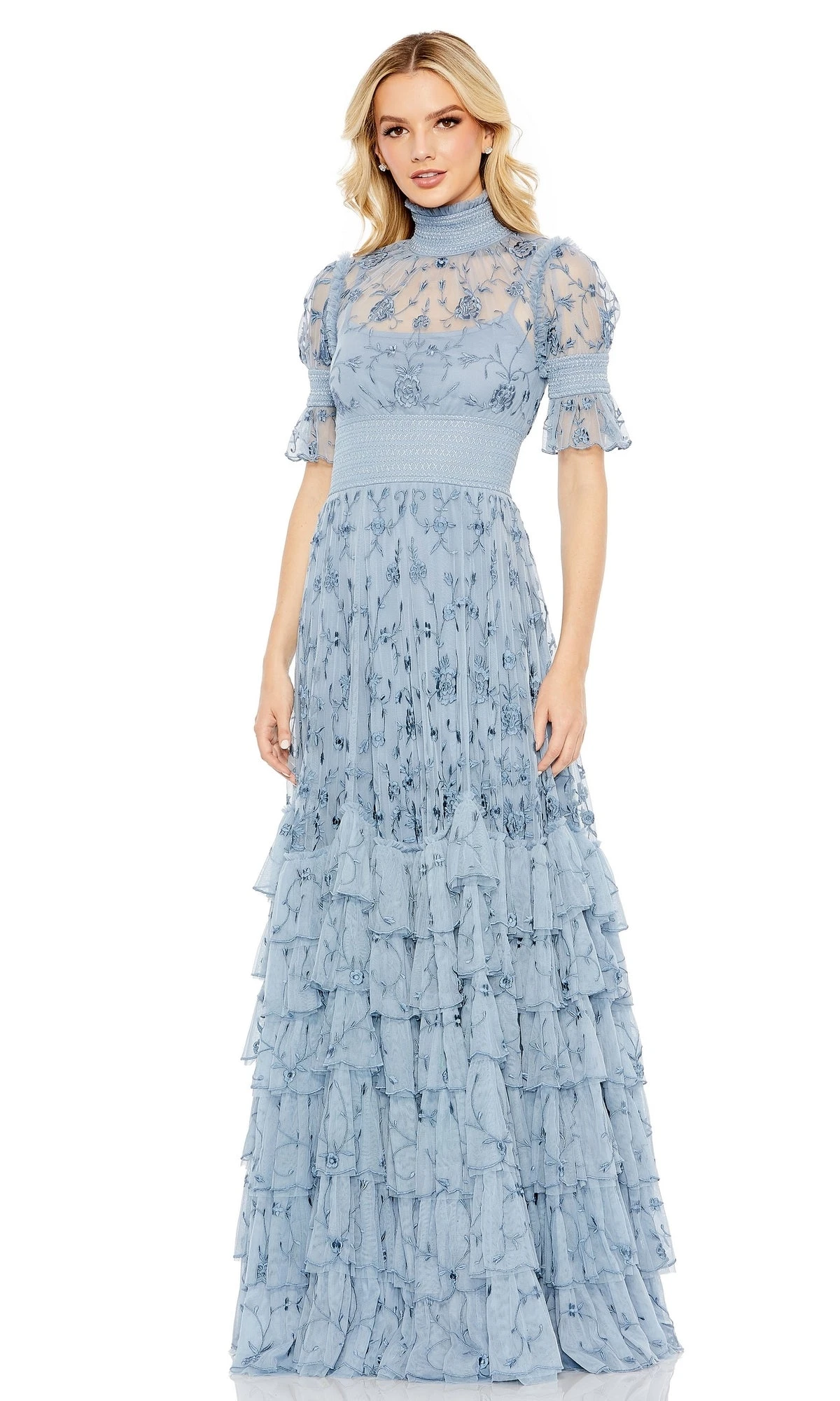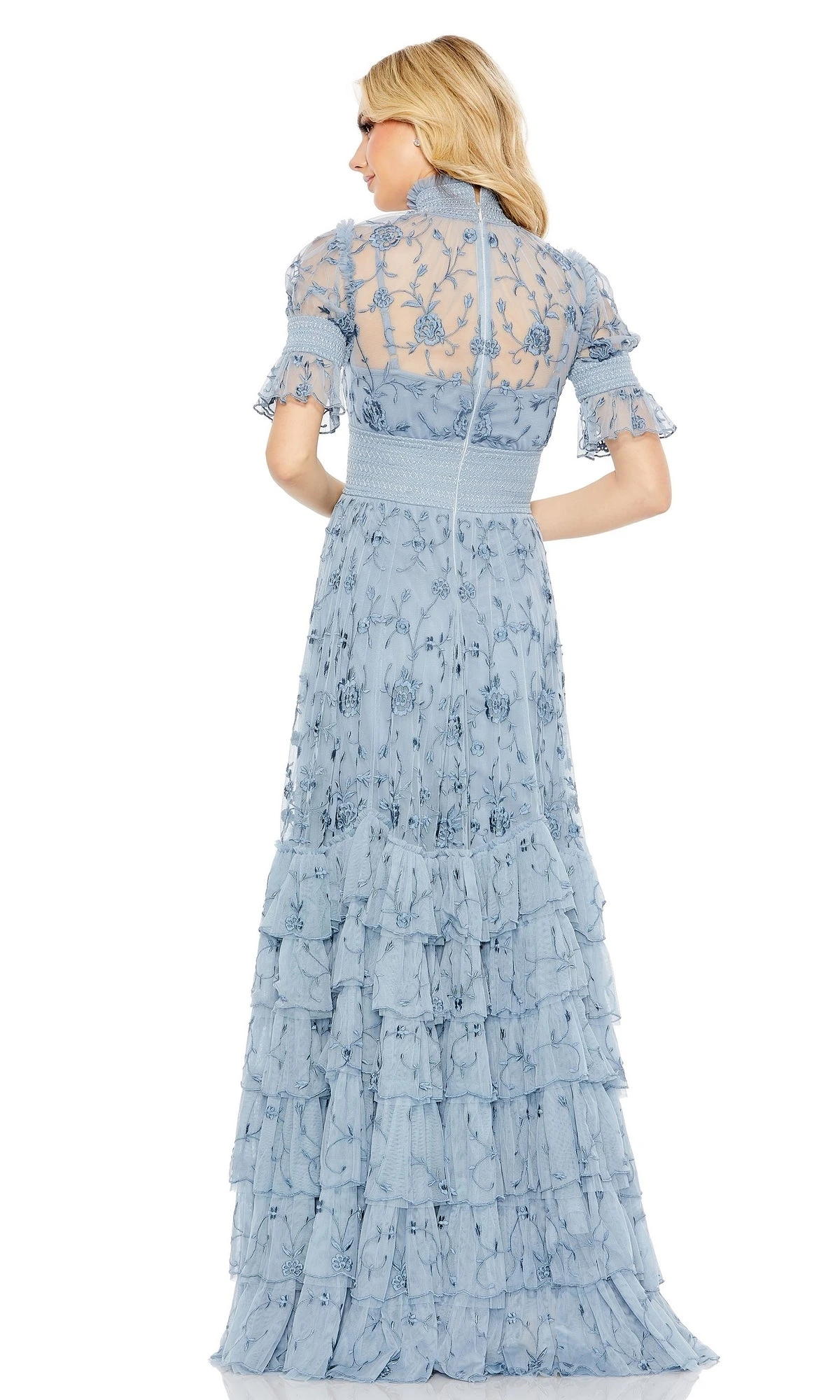 Effortlessly chic and feminine, this formal dress features an empire waist and a ruffled, layered design that is sure to make a statement. The high neckline and short sleeves add a touch of comfort and confidence, making it the perfect choice for any formal occasion.