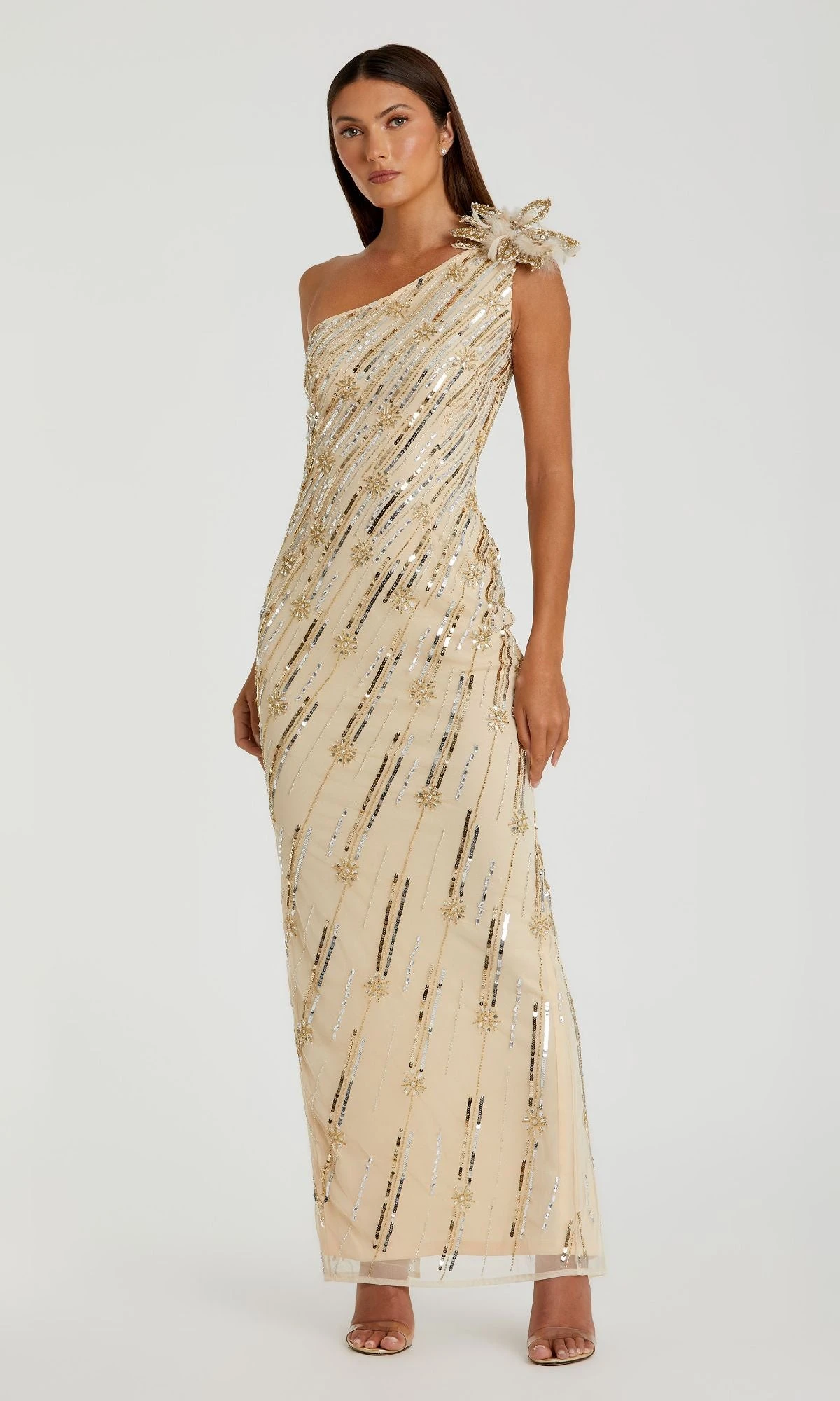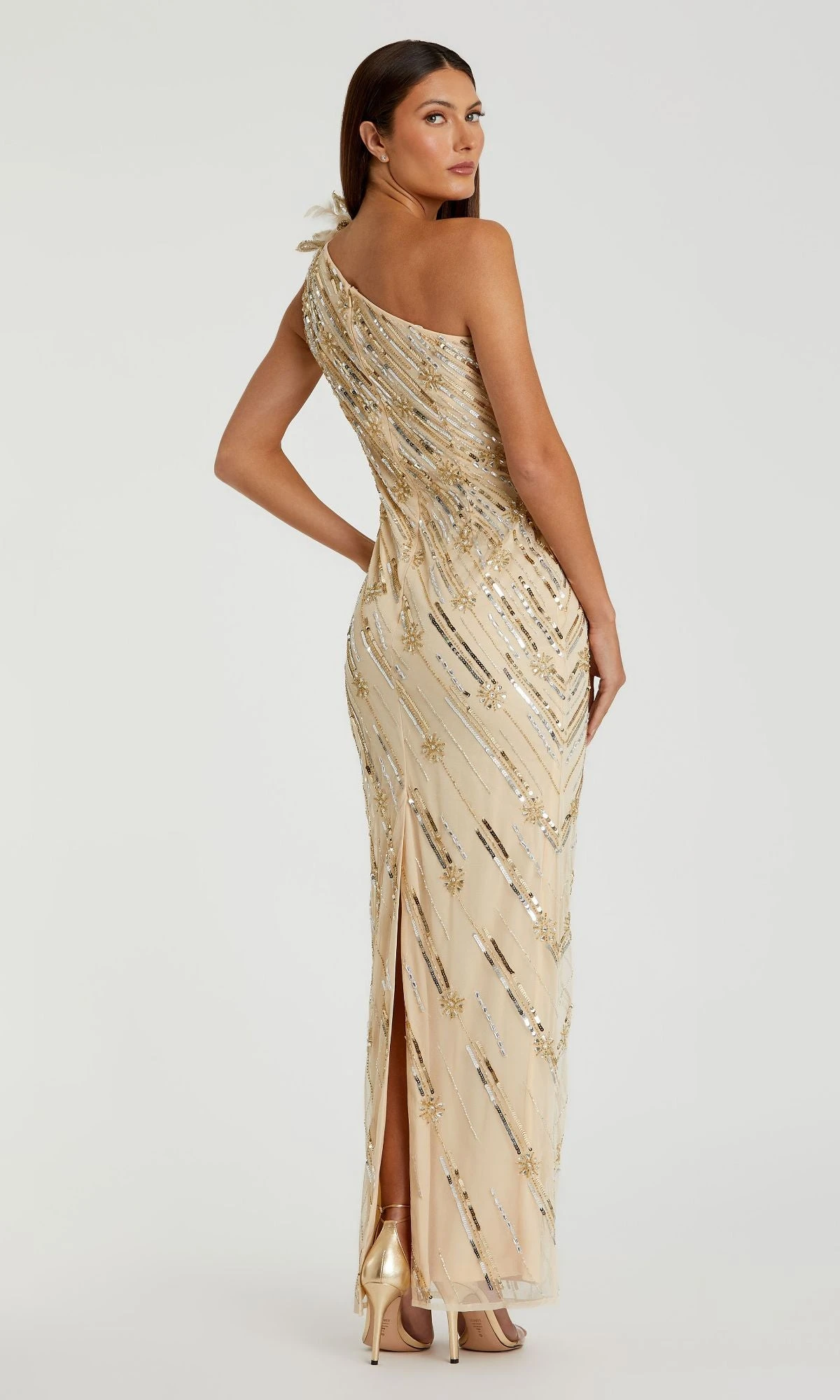 Become the star of any formal event with this beautiful one shoulder nude fitted dress. Its breathtaking gold and silver beading and delicate feather floral accent will make you stand out, while ensuring that you feel both comfortable and confident. Look and feel glamorous with this dress!