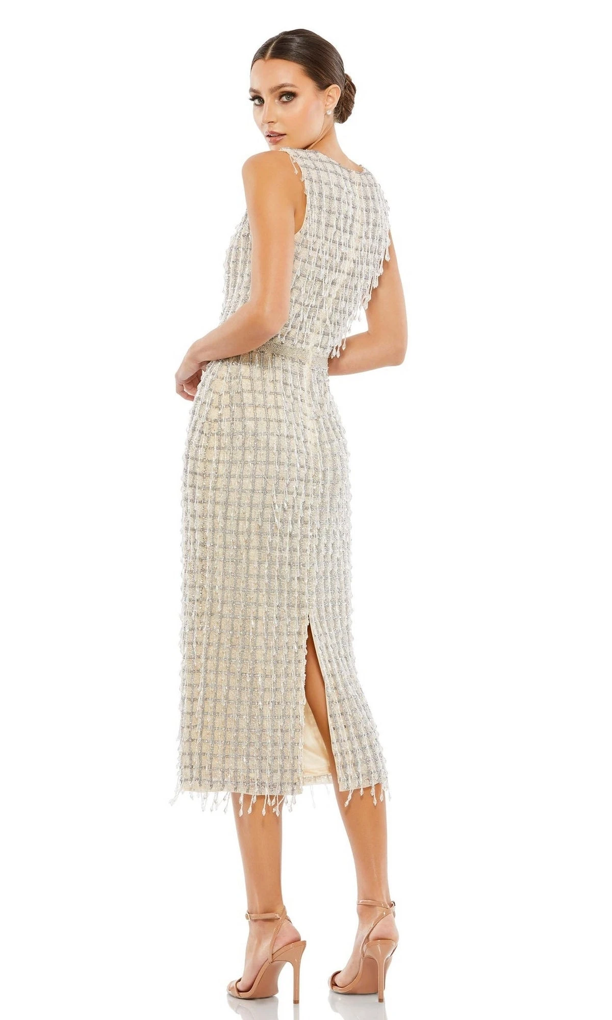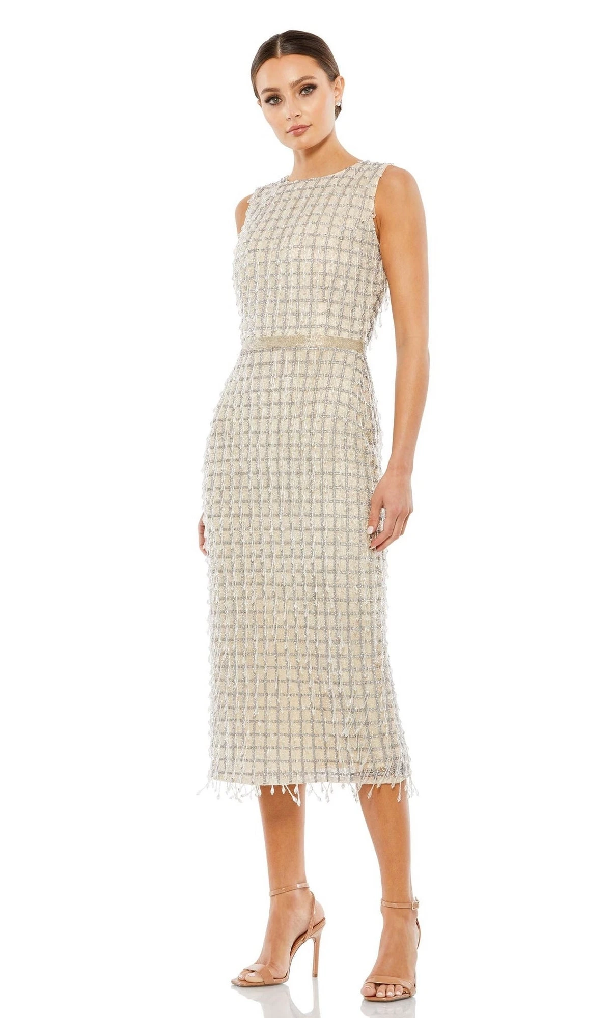 This dress features a sleeveless high neck design and is embellished with intricate beading throughout. The midi length and fitted sheath silhouette are accented by a beaded waistband, creating a stunning and glamorous look.