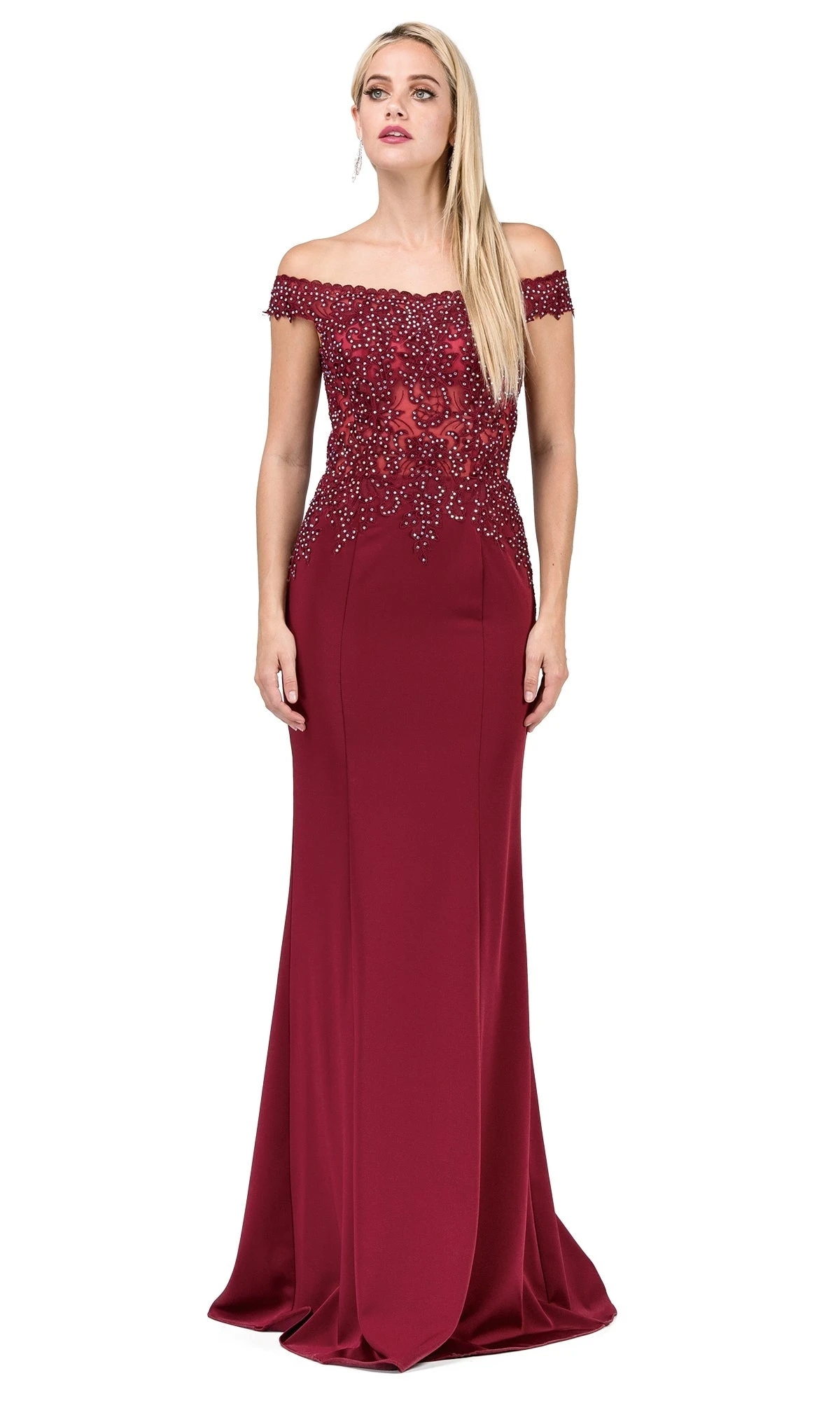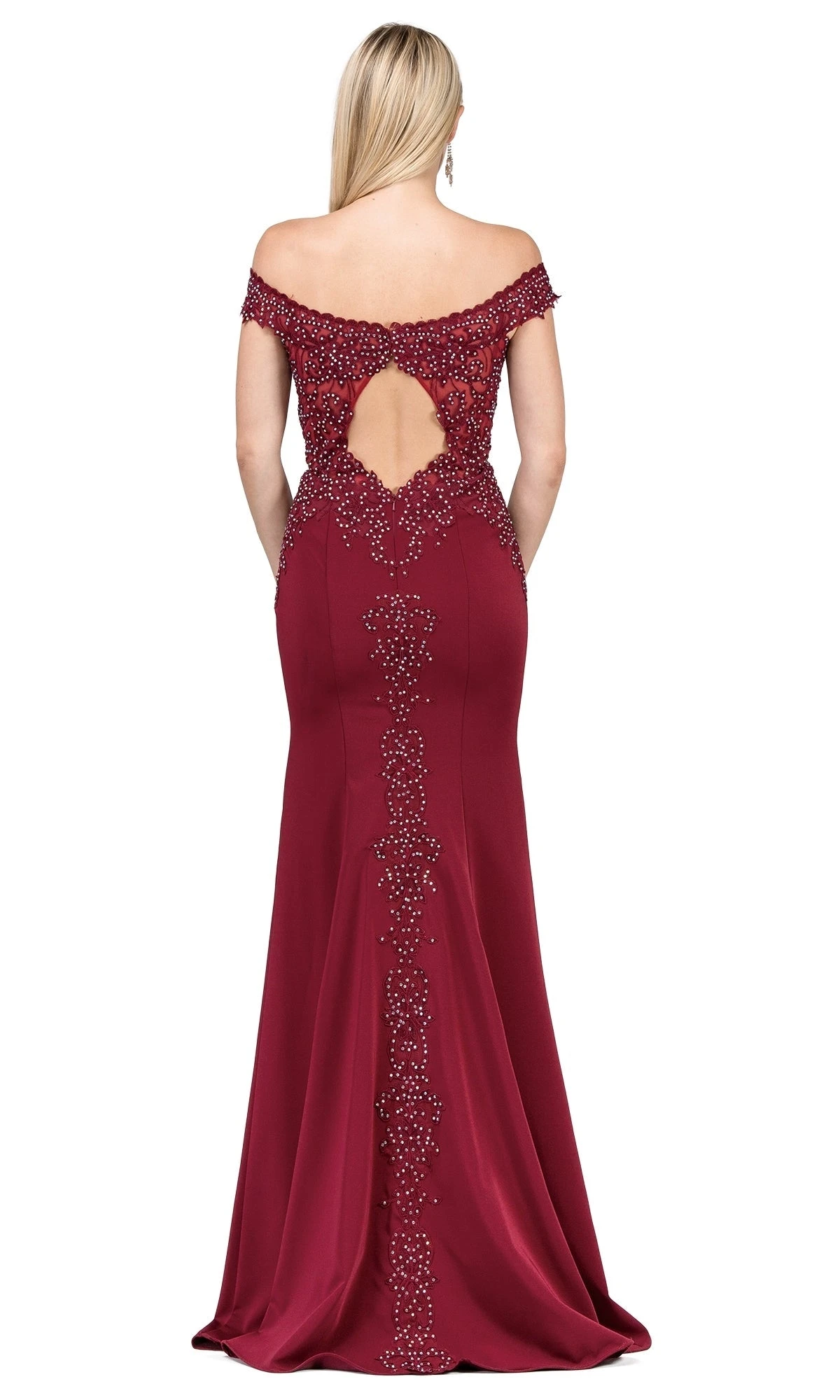 A sophisticated design, this off-the-shoulder long formal dress is perfect for prom, military balls, and other fancy occasions. The sheer bodice of this formal evening dress pops with intricate appliques and beading in all the right places. The off-the-shoulder neckline features beautifully scalloped edges, and a back cut out adds a daring edge to the sheer formal dress. Fitted through the hips, this tight formal dress flatters your natural curves. For an elegant look at your next celebration, wear this off-the-shoulder beaded formal dress.