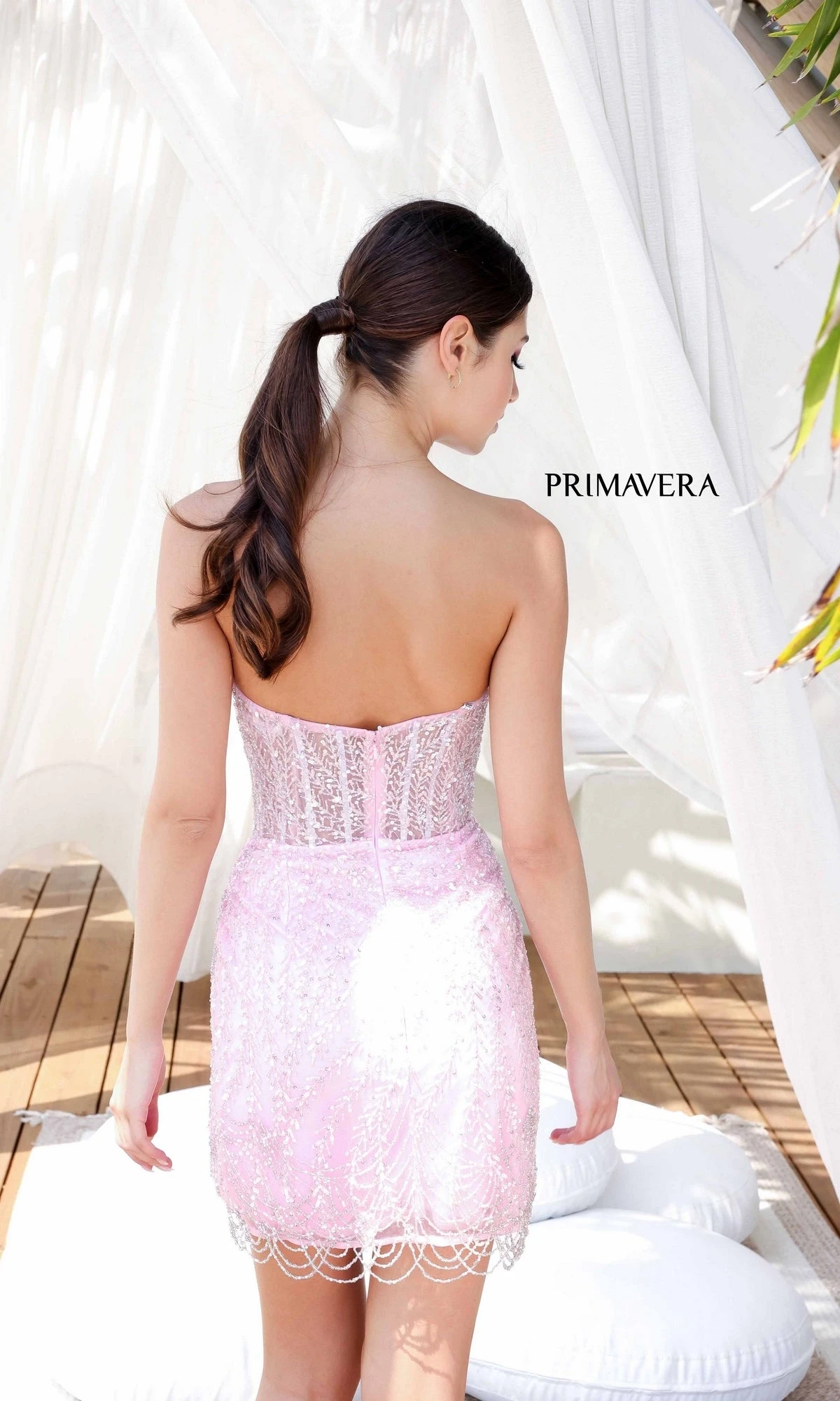 Primavera’s style 4213 is a show-stopping short homecoming dress featuring a strapless boned corset adorned with sparkling beads and fringes. The structured fit enhances your silhouette while the fringe adds playful movement. Ideal for making a statement at your next event, this dress exudes confidence and glamour.