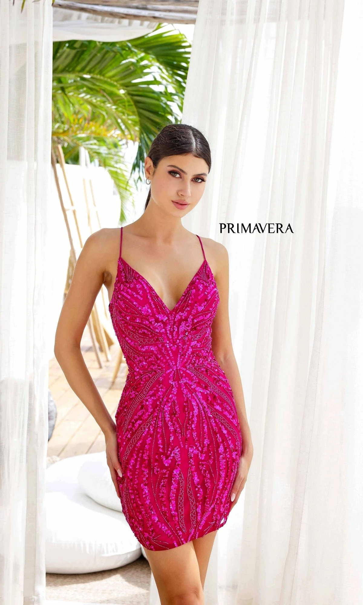 This beaded fitted short party dress by Primavera, style 4250, boasts a v-neckline and an open lace-up back that ensures a custom fit. The detailed beadwork adds an elegant shimmer to your look. Perfect for standing out at any celebration.