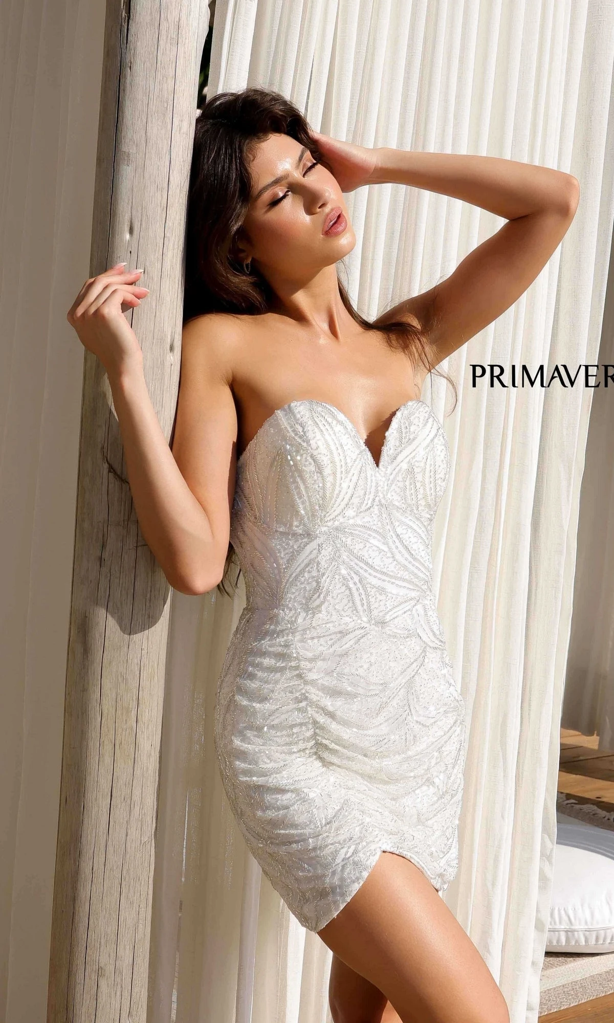 Primavera Style 4259 brings a romantic edge to your night-out look. This strapless sweetheart mini is adorned with intricate floral beadwork that glistens from neckline to hem. Designed to flatter, the fitted silhouette features side gathering that creates a tulip-style hem—adding a soft, sultry touch. Whether it’s homecoming, a wedding, or any semi-formal event, this beaded dress is the perfect blend of sparkle and shape for a look that’s unforgettable.