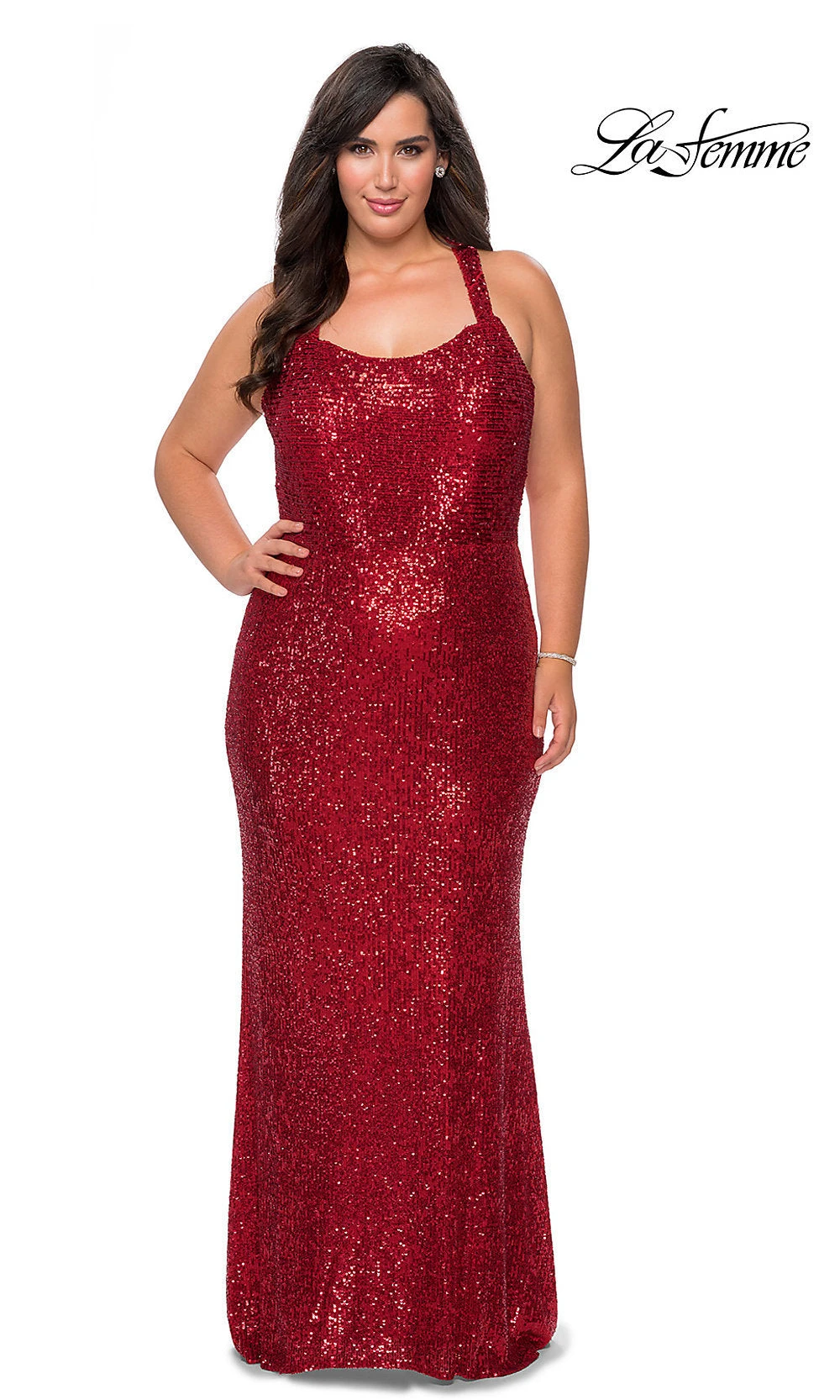 Simply spectacular, this long sequin plus-size prom dress is ready to wow the crowd on your big night. From the designers at La Femme, this dazzling long plus-size sequin evening gown is a radiant choice for prom, a military ball, or another formal event. With a slight scoop neckline, this gorgeous plus formal dress includes bra-friendly shoulder straps that criss cross before attaching in the back. The curve-hugging plus-size designer dress smooths over the hips before flaring gently around the knees and draping to the floor. An impressive style for your memorable evening, this long sequin plus-size prom dress by La Femme is as radiant as it is figure flattering.